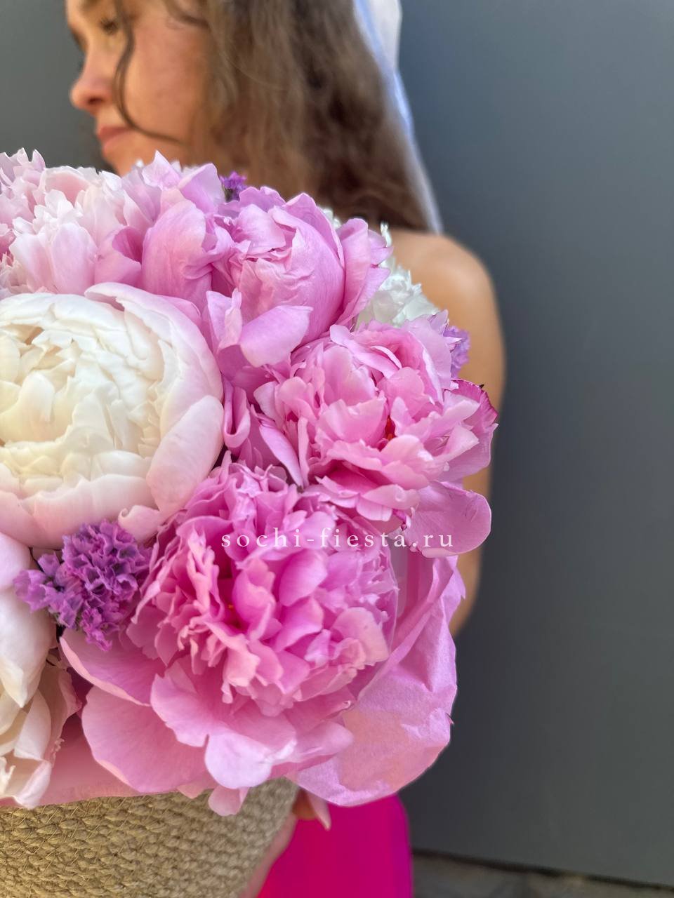 пионы, джутовое кашпо - D16, эвкалипт, лента, упаковка.