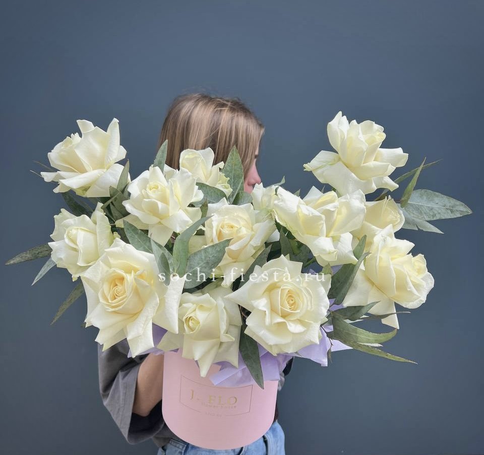 белые розы, цилиндр D20, эвкалипт, лента, упаковка.