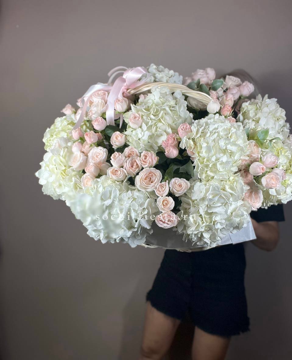 гортензия, кустовые розы, розы, лимониум, эвкалипт, лента, корзина D40.