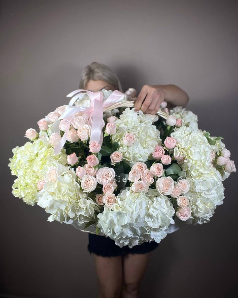Корзина в лавандовых тонах объединяет пышные соцветия гортензии, кустовые и классические розы с воздушным лимониумом. Эвкалипт добавляет графику и свежесть всей композиции.