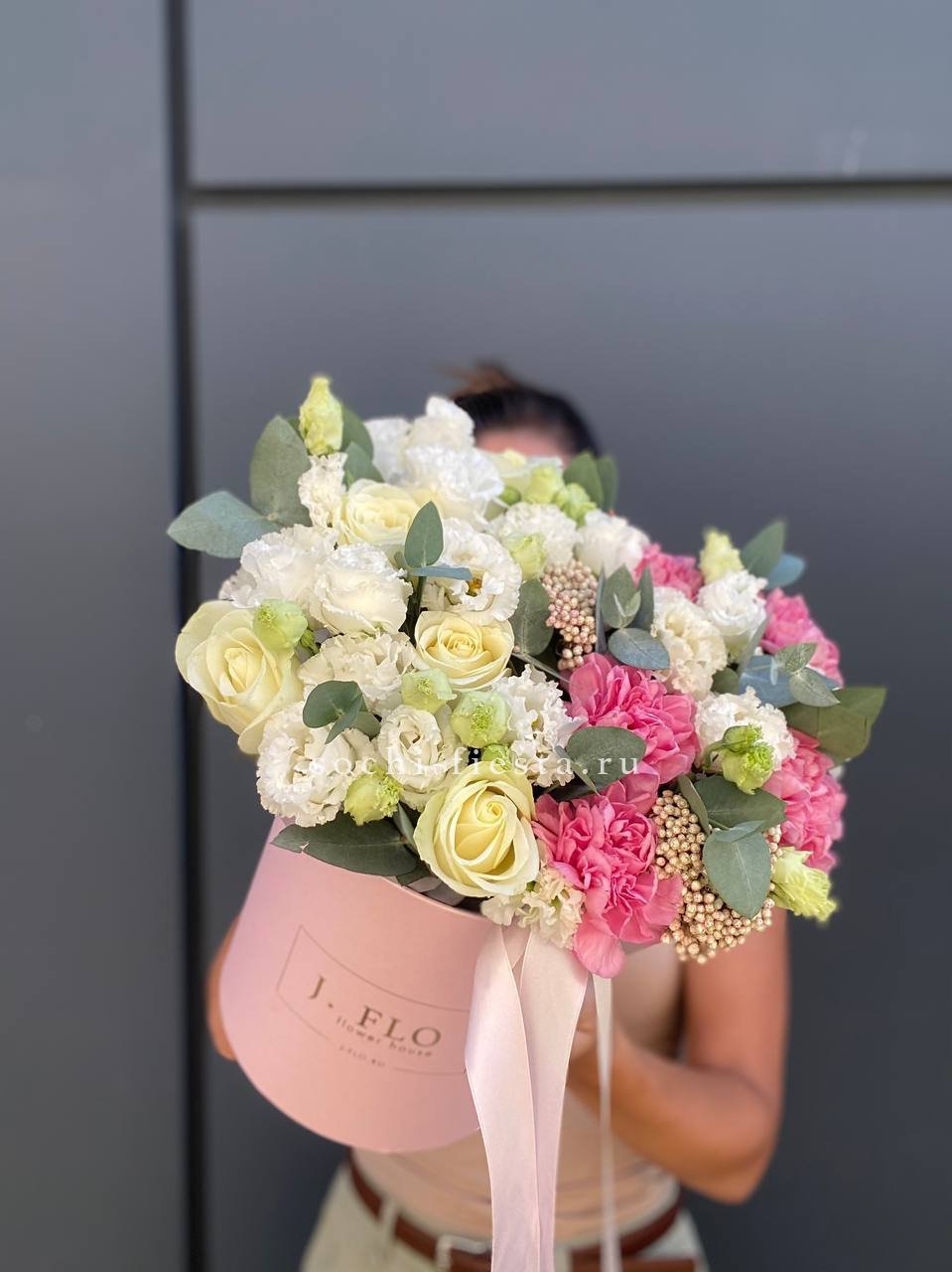 Белые розы встречаются с лиловым диантусом и кремовой эустомой в круглом боксе. Озотамнус и эвкалипт создают фактурный фон для цветочной композиции.