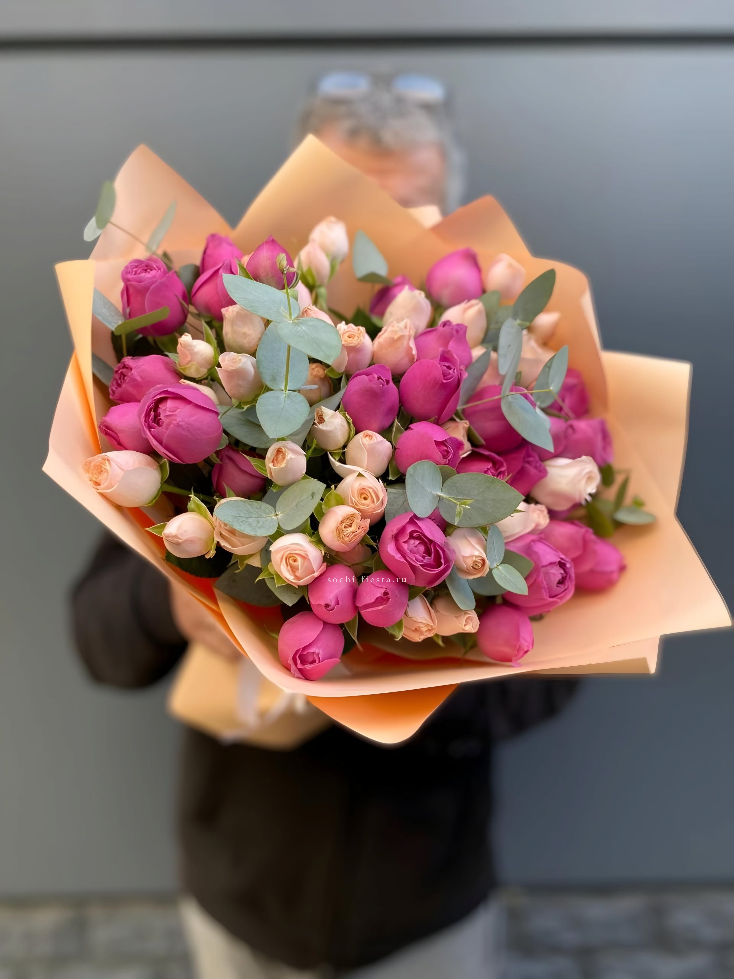Пятьдесят пять бутонов создают объемную композицию с выразительным силуэтом. Розовый цвет наполняет пространство светом. Авторское оформление завершает образ.