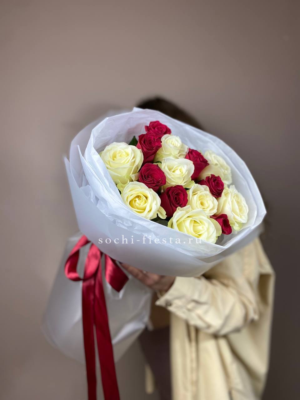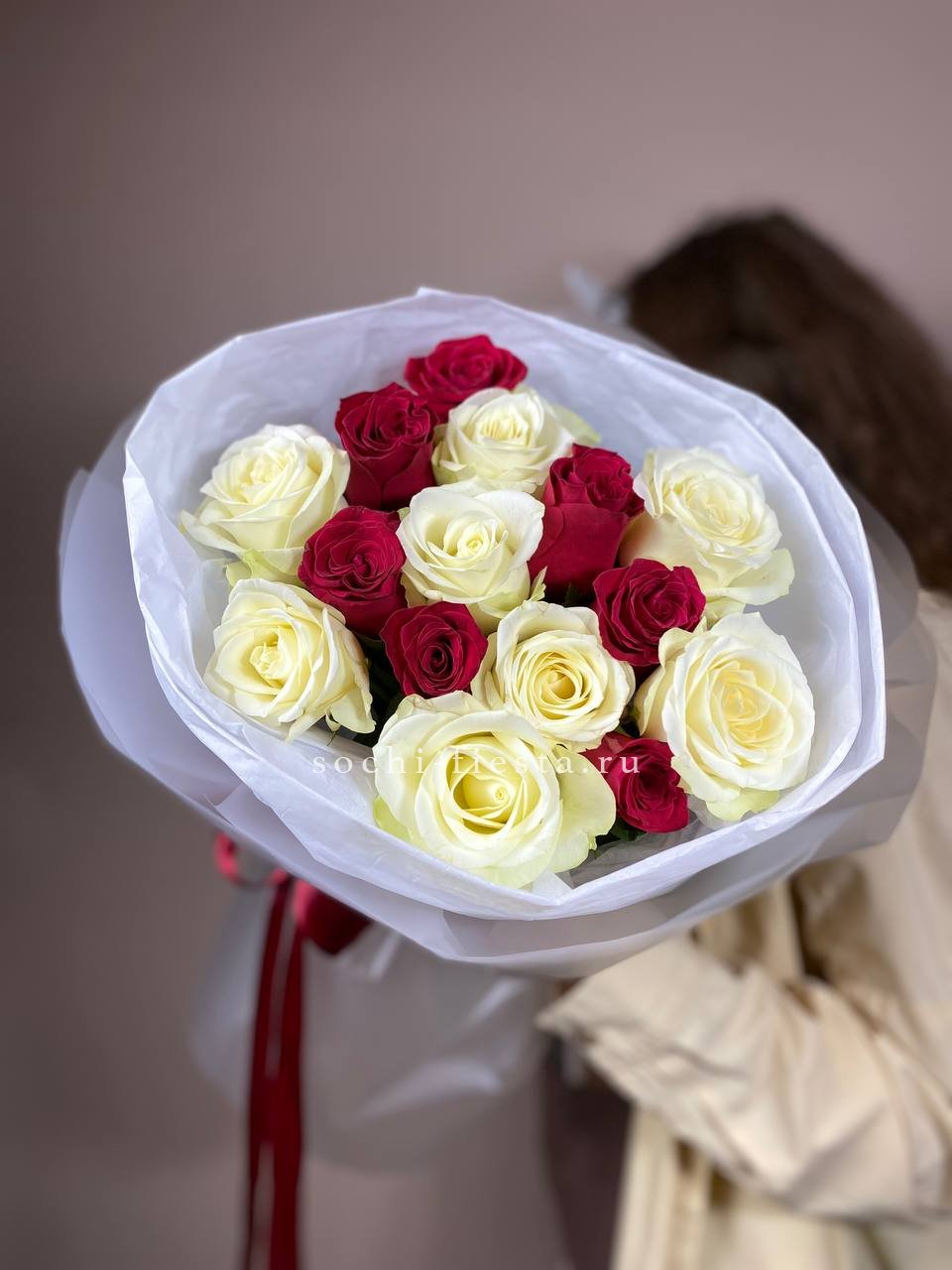 Изначальная цена указана за букет из 15 роз Состав букета на фотографии: 21 кенийских роз, лента, упаковка.