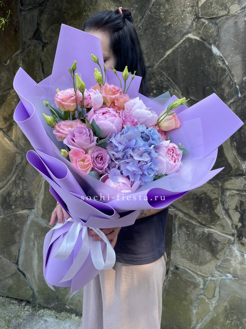 Пышные бутоны Сара Бернар раскрываются среди лепестков роз и воздушной гортензии. Эустома добавляет графичности, а эвкалипт собирает композицию в единый силуэт. Цветовая гамма плавно перетекает от розового к голубому.