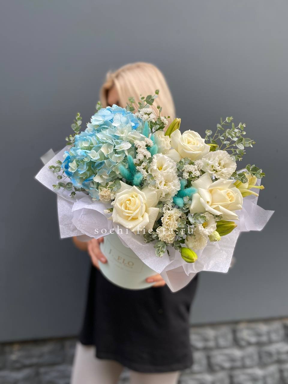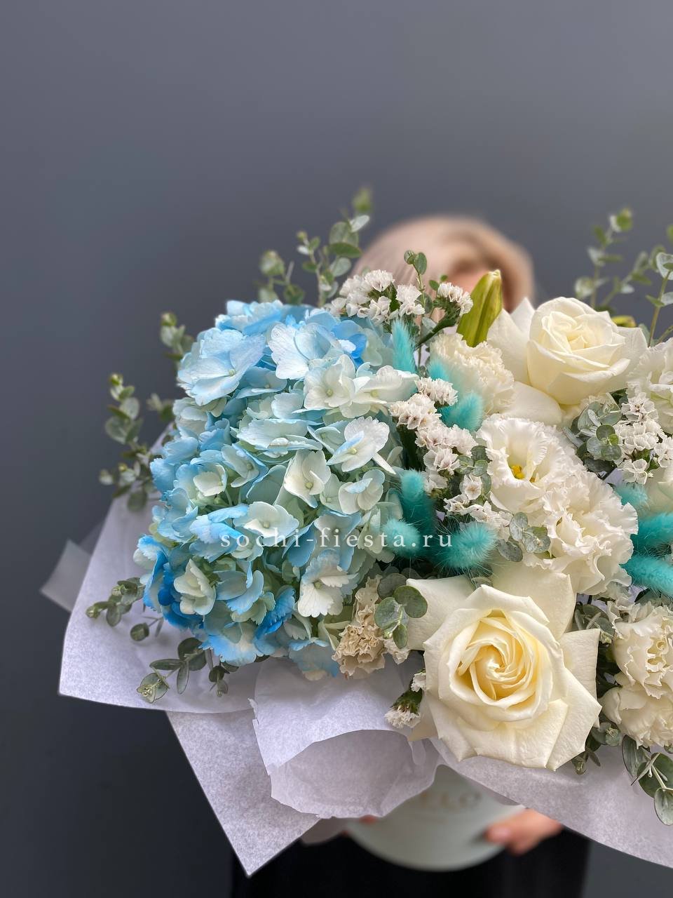 гортензия, эустома,  лента и дизайнерская пленка.
