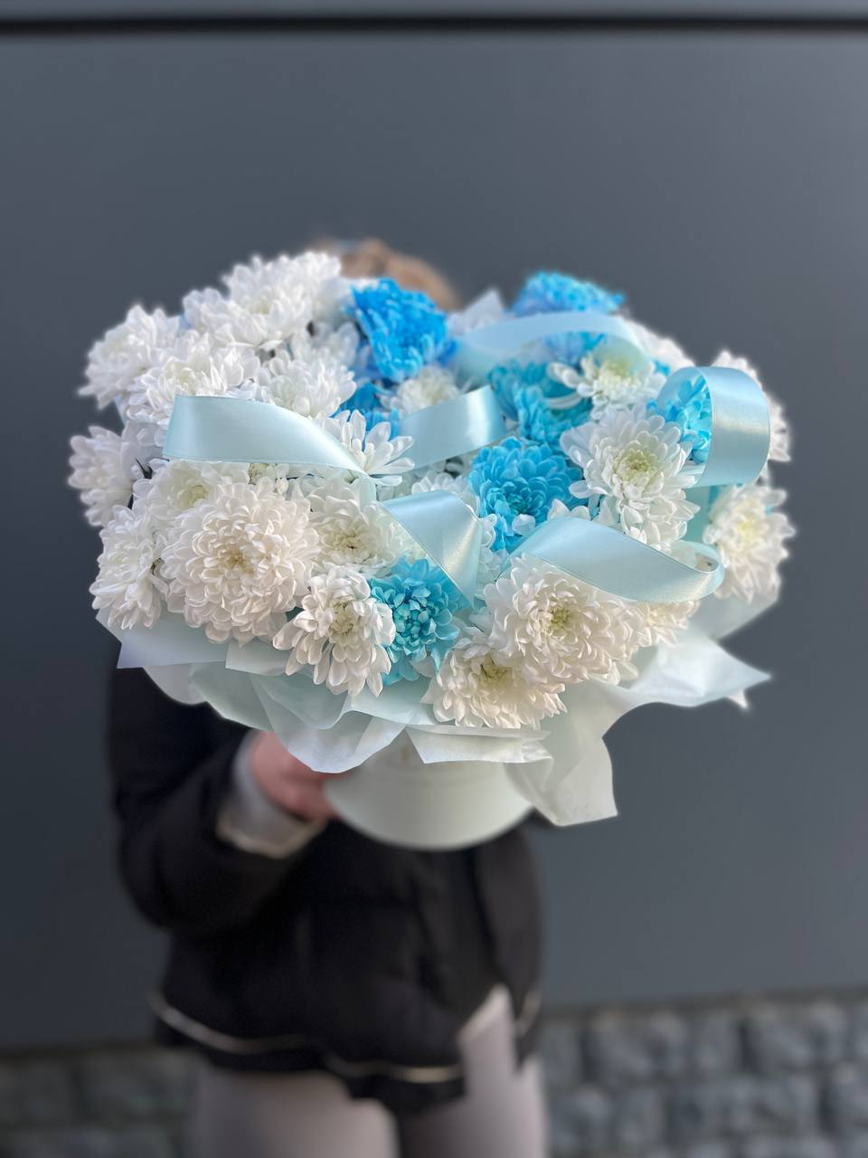 Fifteen веток кустовой хризантемы образуют пышное облако из множества мелких бутонов. Простая упаковка не отвлекает от густоты соцветий и их природной фактуры. Букет долго сохраняет свежесть и объём.