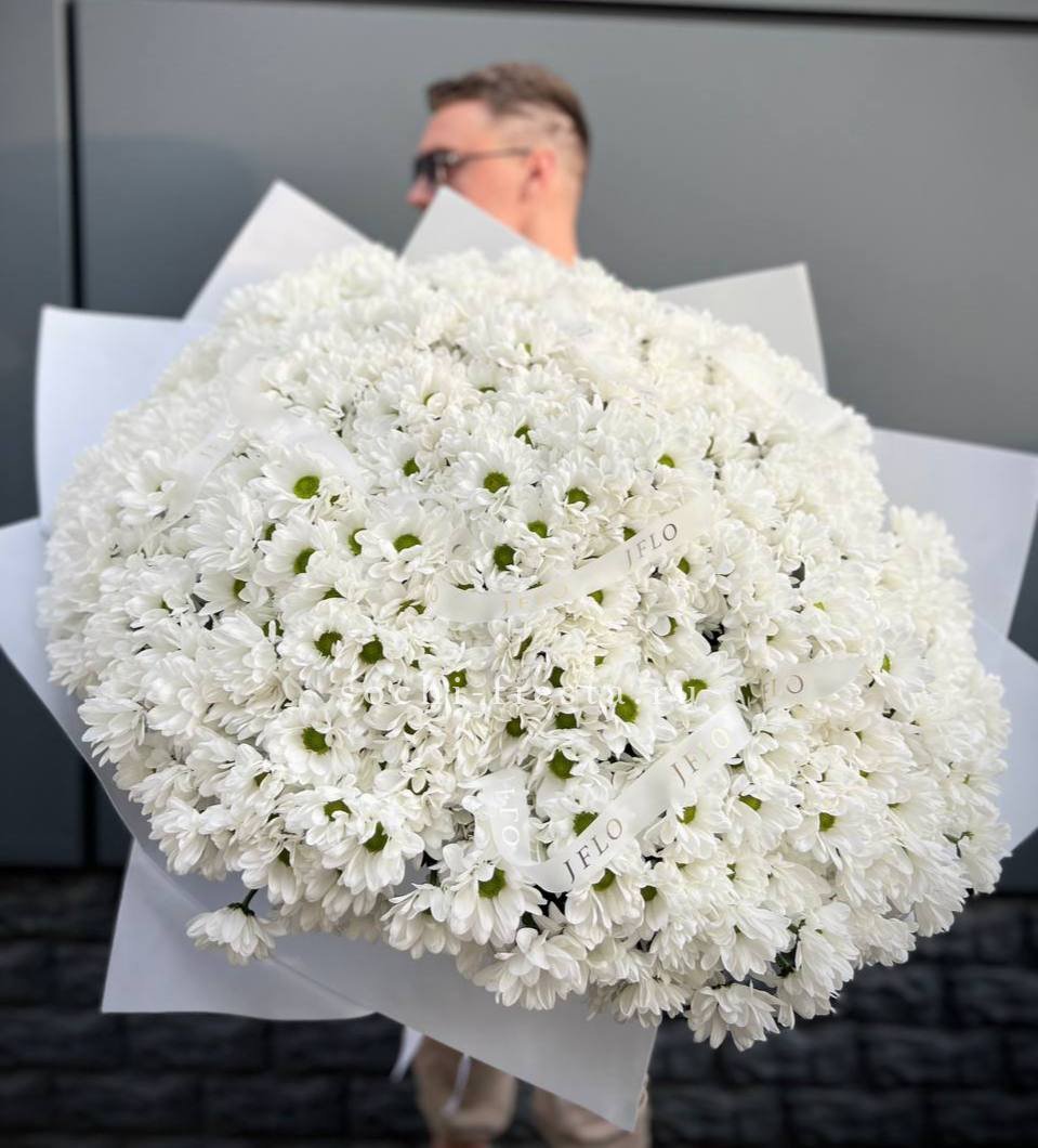 Девятнадцать веток белоснежных хризантем собраны в плотный купол. Множество мелких соцветий создают объёмную текстуру, словно морозный узор. Монохром в чистом виде для минималистичного интерьера.