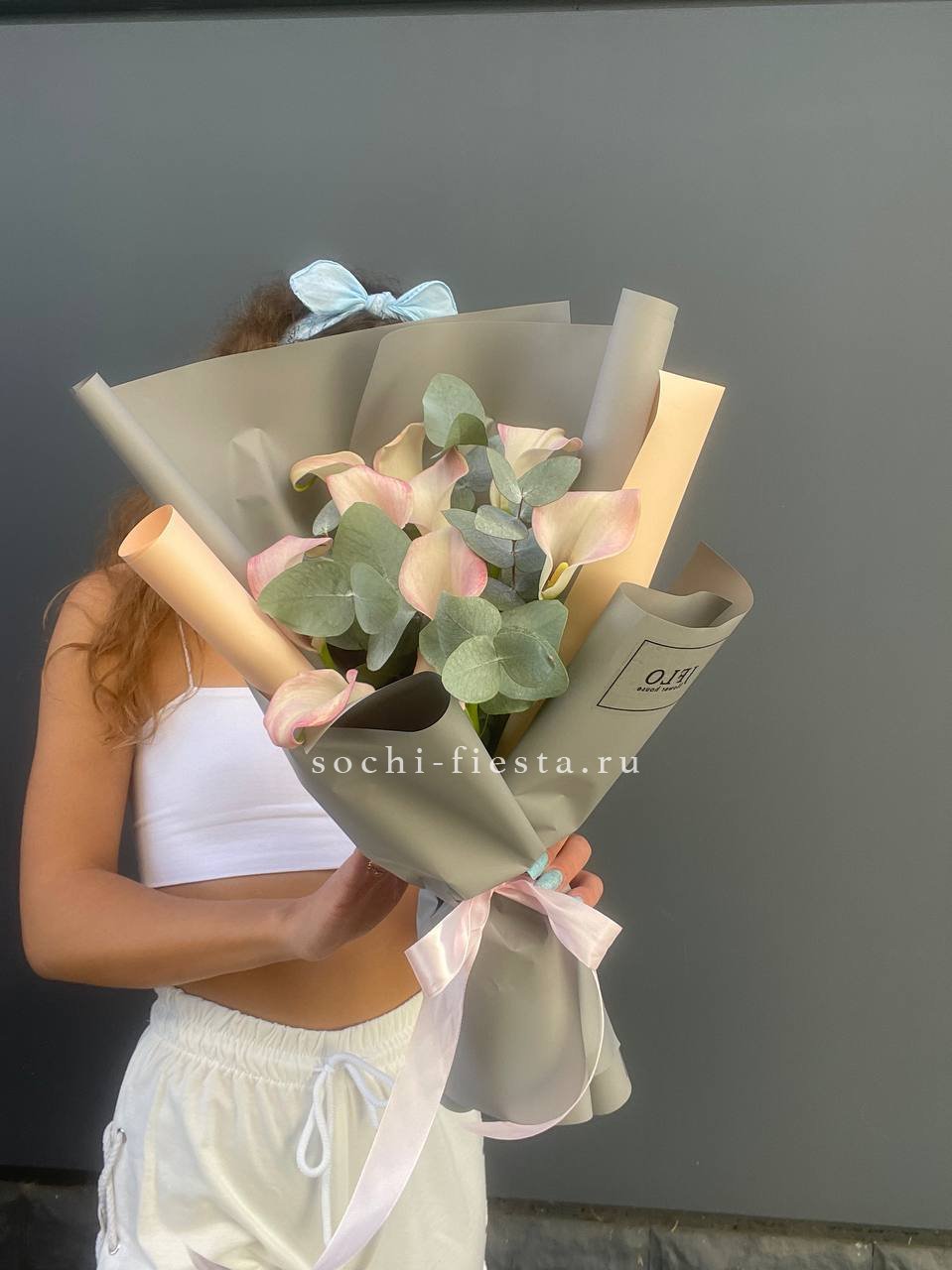 каллы - 9шт., декоративная зелень, лента.