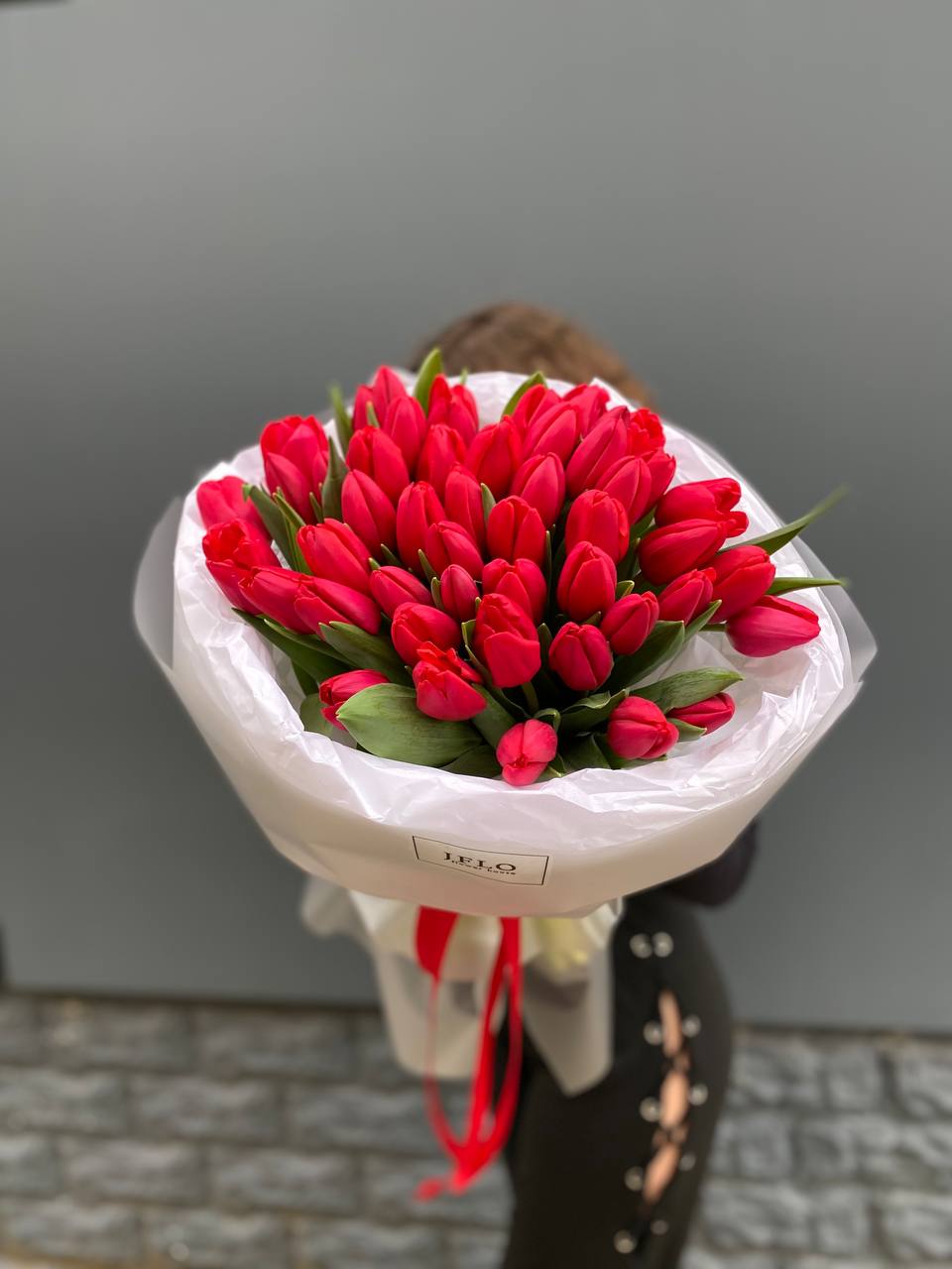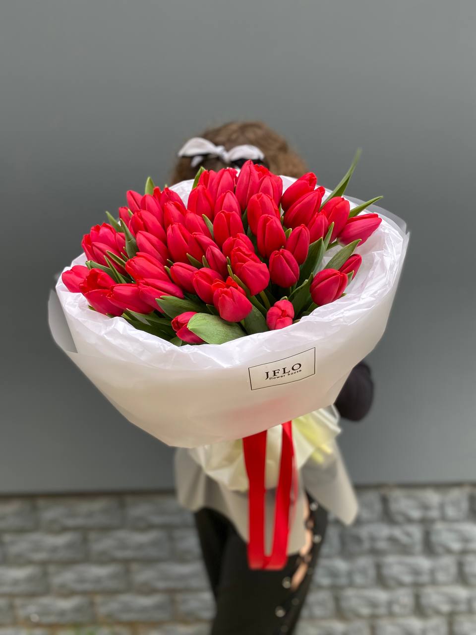 Сто один белоснежный тюльпан собран в плотную охапку с безупречной геометрией. Классическая упаковка сохраняет естественную красоту бутонов и подчёркивает масштаб композиции.