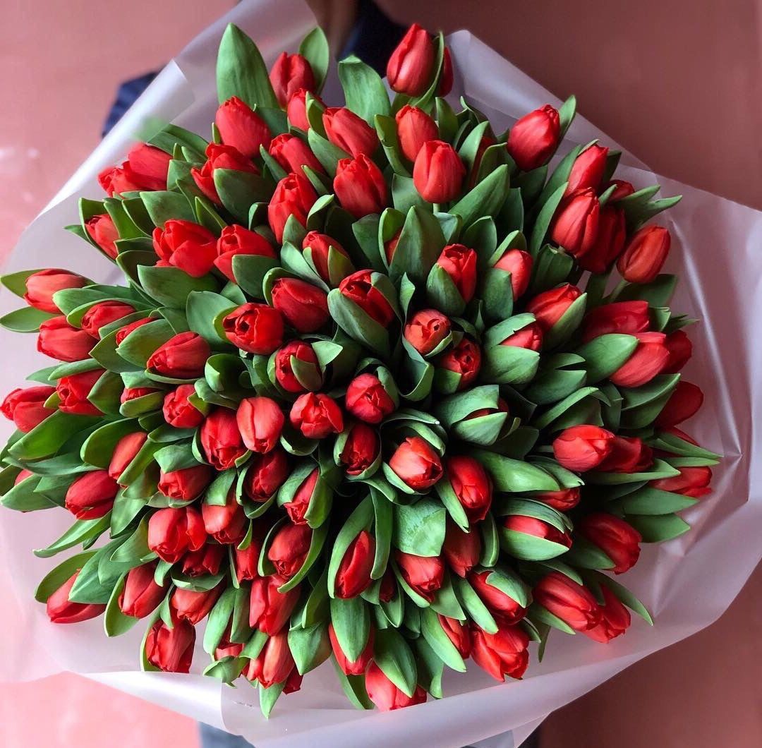 Сто один бутон собран в плотную охапку, где каждый стебель держит линию и создаёт объём. Красные головки тюльпанов образуют живую волну, которая заполняет пространство цветом и движением. Такая композиция говорит сама за себя.