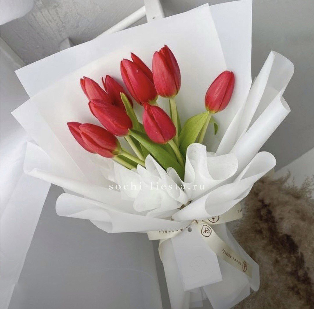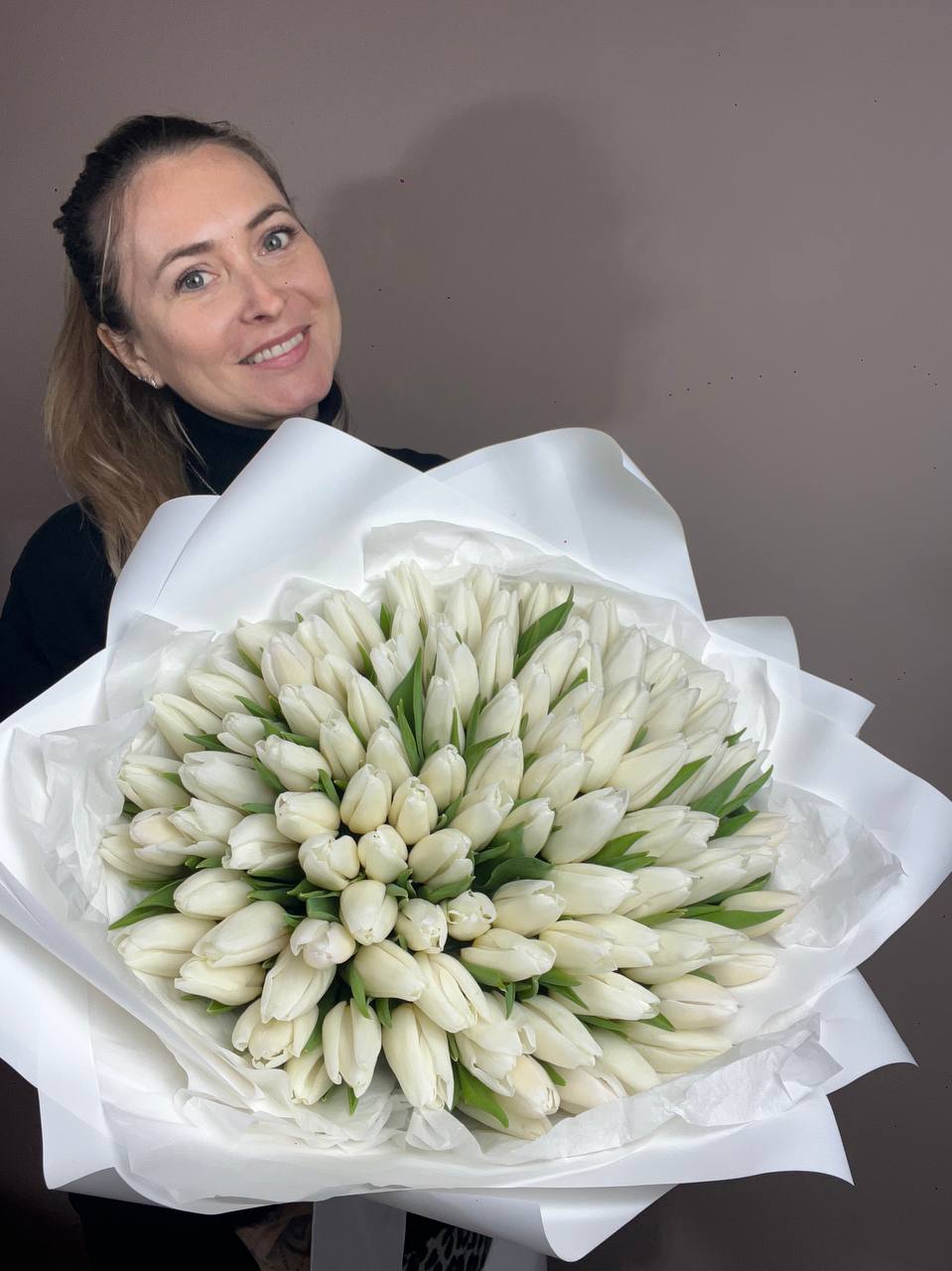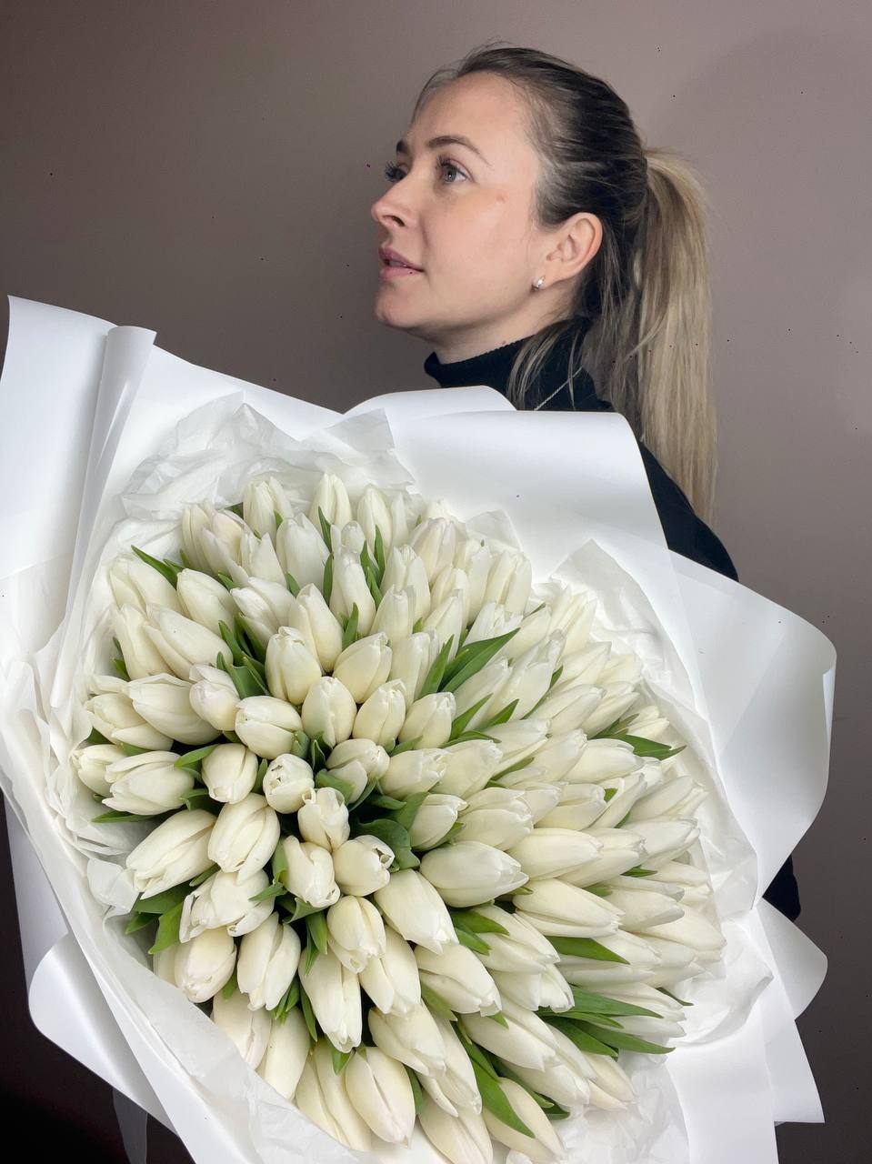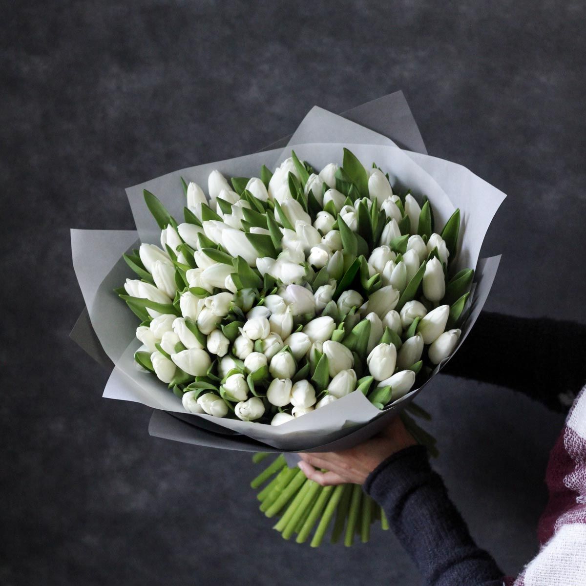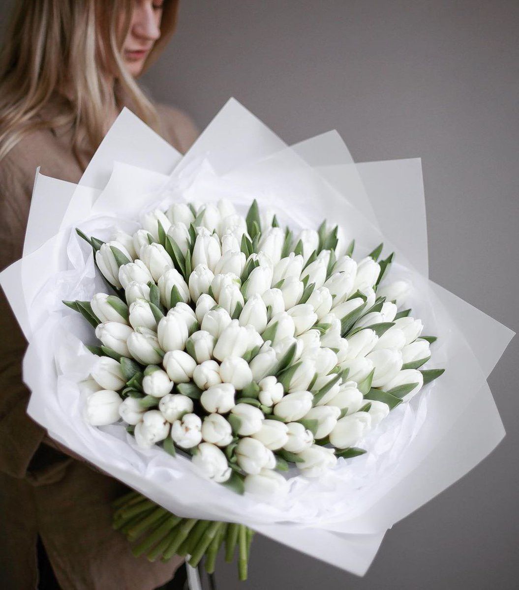 Пятьдесят один белоснежный тюльпан собран в плотный монохромный букет с мягкими соцветиями лагуруса. Чистая графика весенних бутонов создает ощущение свежести и простора.