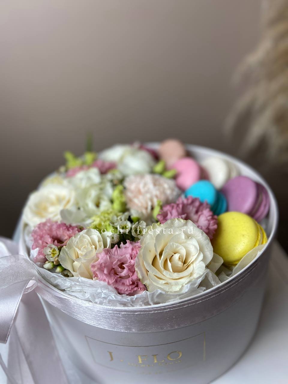 эустомы, розы, гипсофила или хамелациум, диантус,  макарон 6шт, зелень, лента, цилиндр.