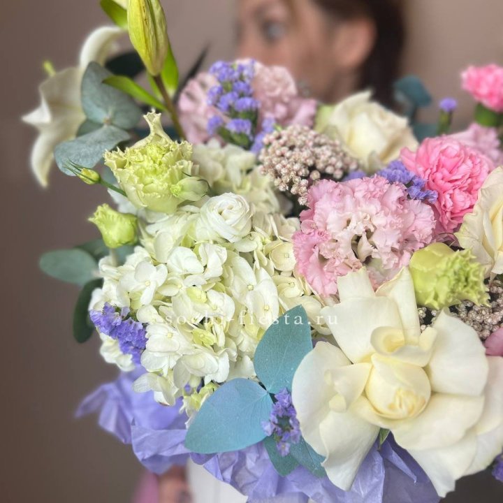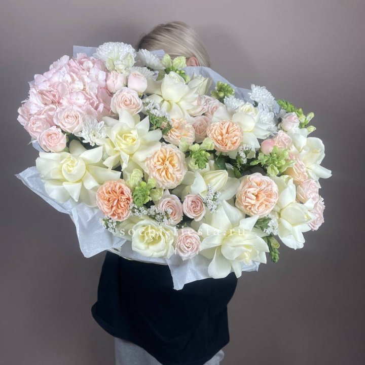 - Редкий состав — David Austin, ранункулюс, анемоны, сезонные пионы.