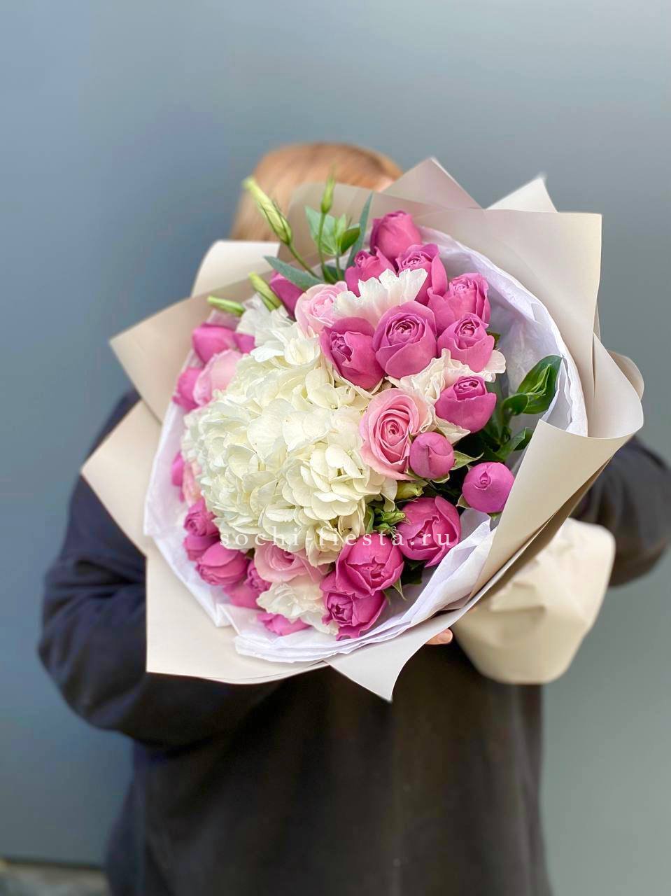 гортензия, диантус, кустовая пионовидная роза, эустома, орхидеи (или аналог), эвкалипт, лента, дизайнерская упаковка.