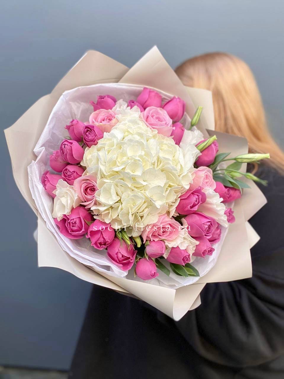 Пышные шапки гортензии переплетаются с бархатными бутонами пионовидных роз, создавая объёмную композицию насыщенного розового оттенка. Орхидеи и эустома добавляют воздушности, а диантус расставляет яркие точки. Букет заполняет пространство и притягивает взгляд своей плотной структурой.