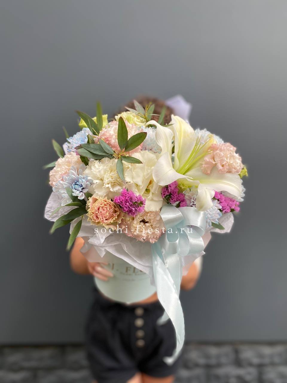 Композиция собрана из белых лилий и мелких соцветий в лавандовых и розовых тонах. Цилиндр объединяет цветы разной высоты и создает впечатление летнего букета в компактной форме.