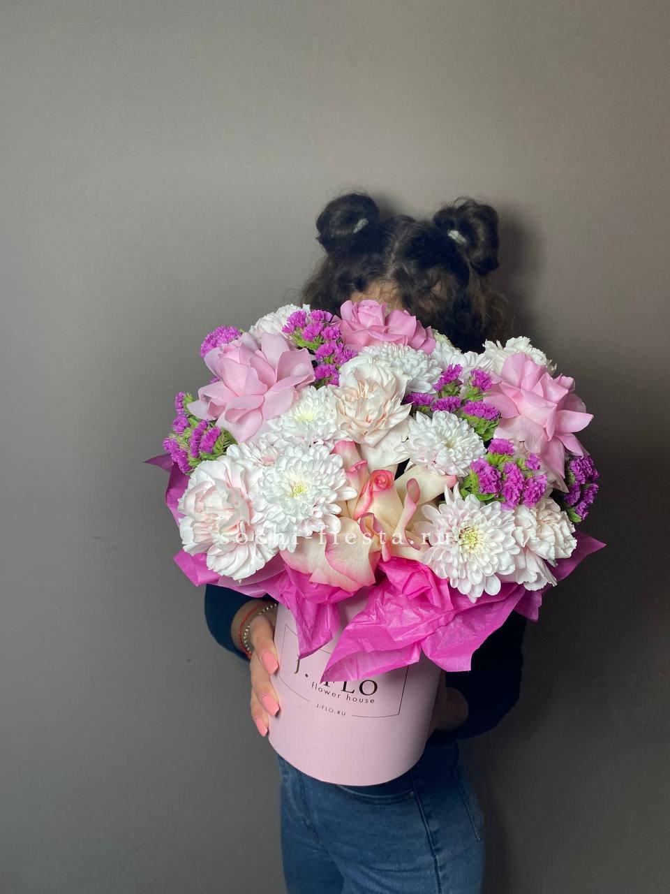 Композиция в цилиндре объединяет одноголовые и кустовые розы с пышной гортензией. Лимониум добавляет воздушности. Мягкая игрушка завершает образ.