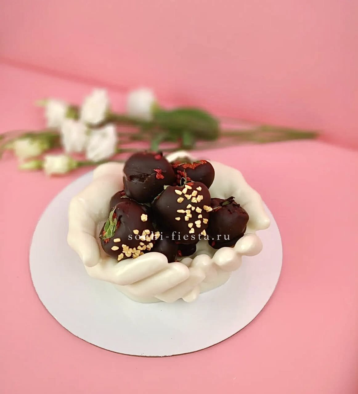 Свежая клубника в бельгийском шоколаде размещена на ладонях из того же материала с жестом мира. Посыпка из орехов или конфетти добавляет текстурный акцент каждой ягоде.