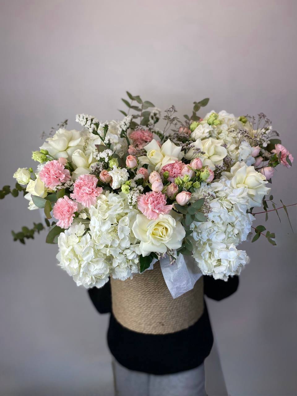 джутовый бокс в бело-розовой гамме с розовым эвкалиптом.
