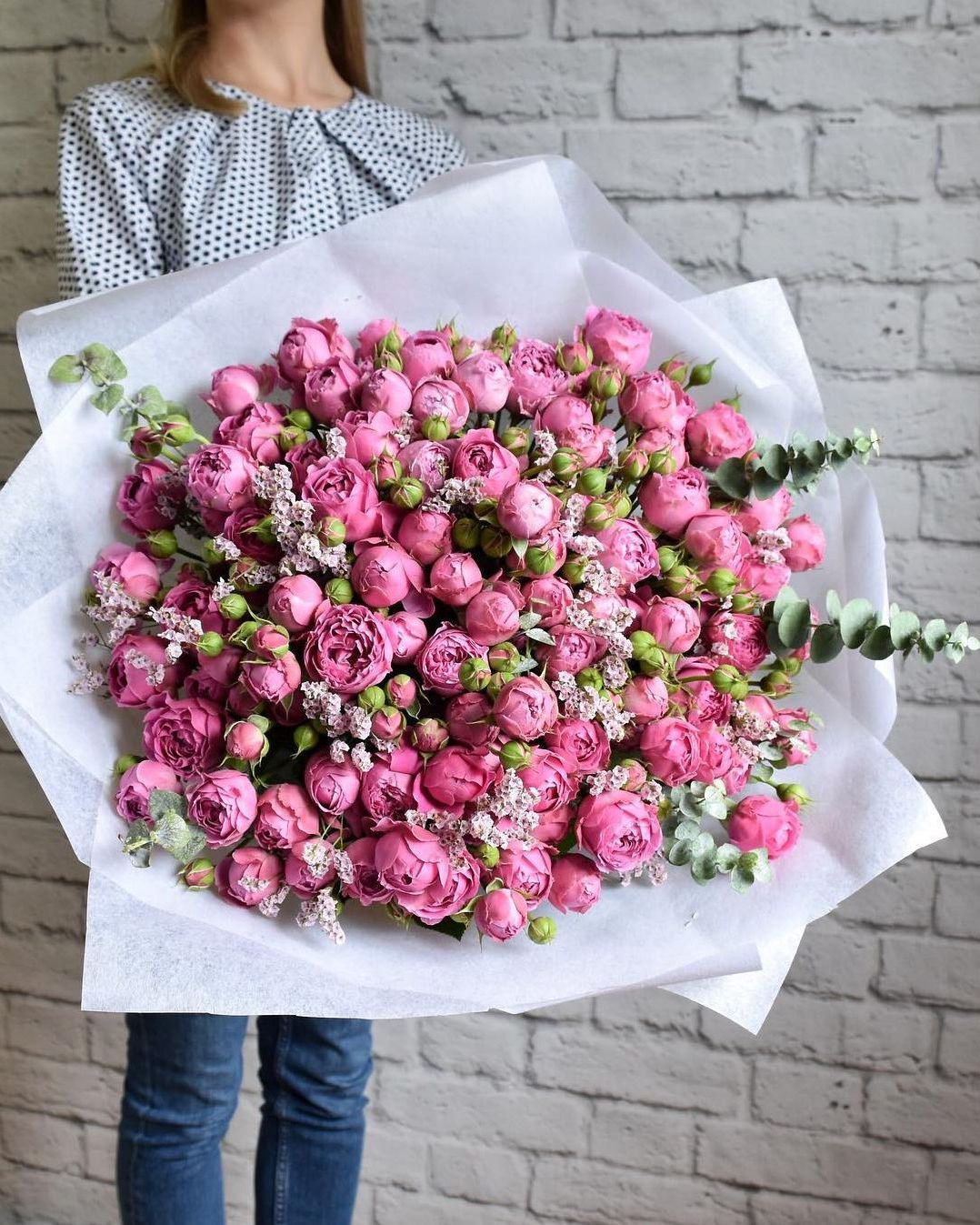 кустовые пионовидные розы Бомбастик, эвкалипт, цилиндр D13, бумага тишью, лента.
