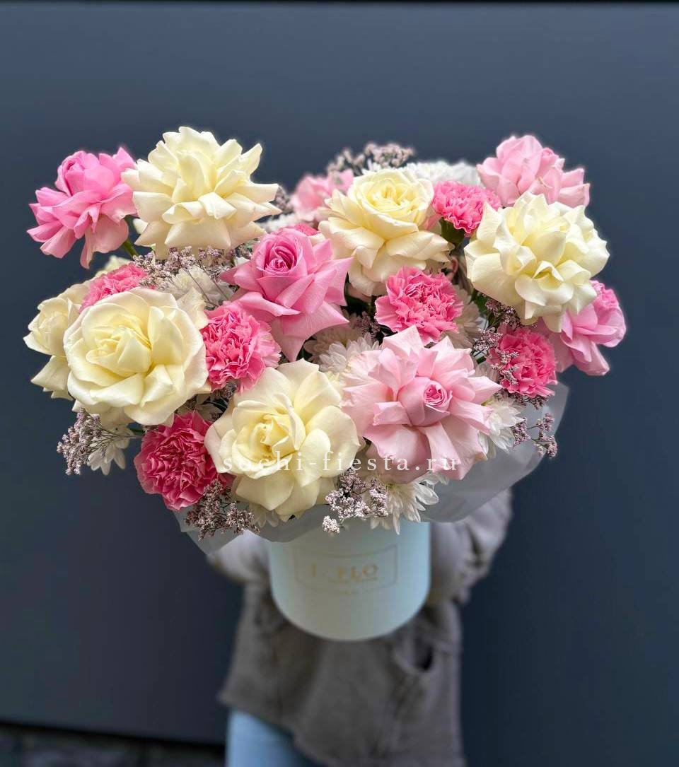 Для заказа товара "Коробка французских роз и диантусов "Бони"" с доставкой в Дзержинске нажмите в корзину