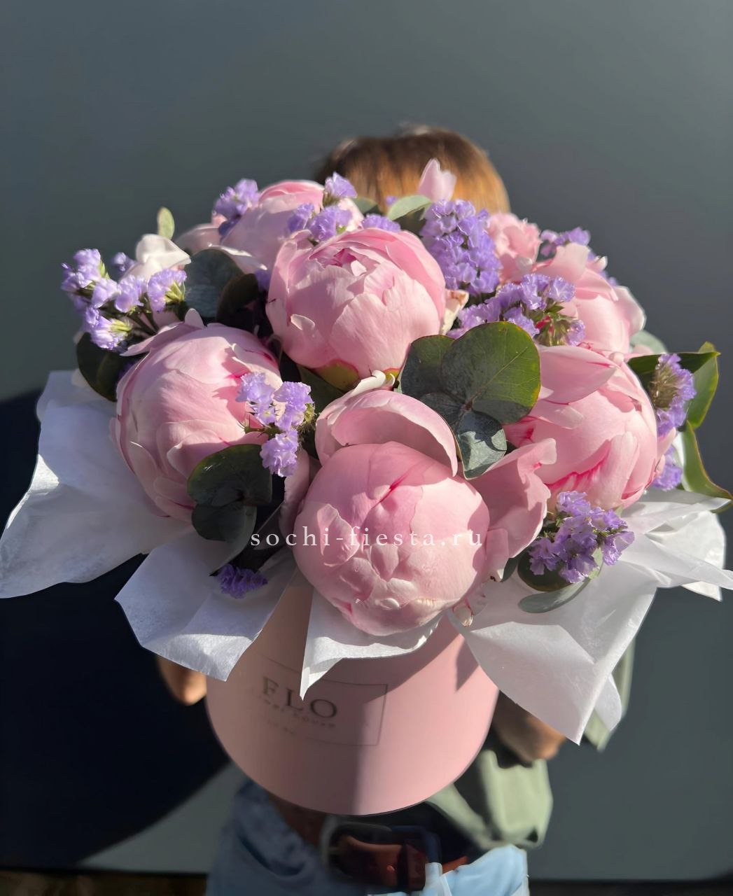 Пионы сочетаются с фиолетовыми соцветиями лаванды или статицы в цилиндре. Лавандовые оттенки создают прохладную гамму и освежают восприятие композиции.