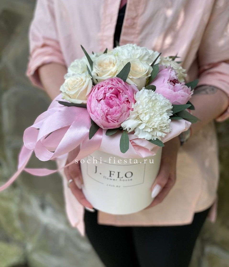 пионы, розы одноголовые, диантусы, тишью, коробка D13 Цвет коробки может быть согласован с заказчиком.