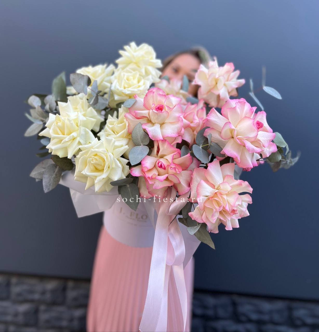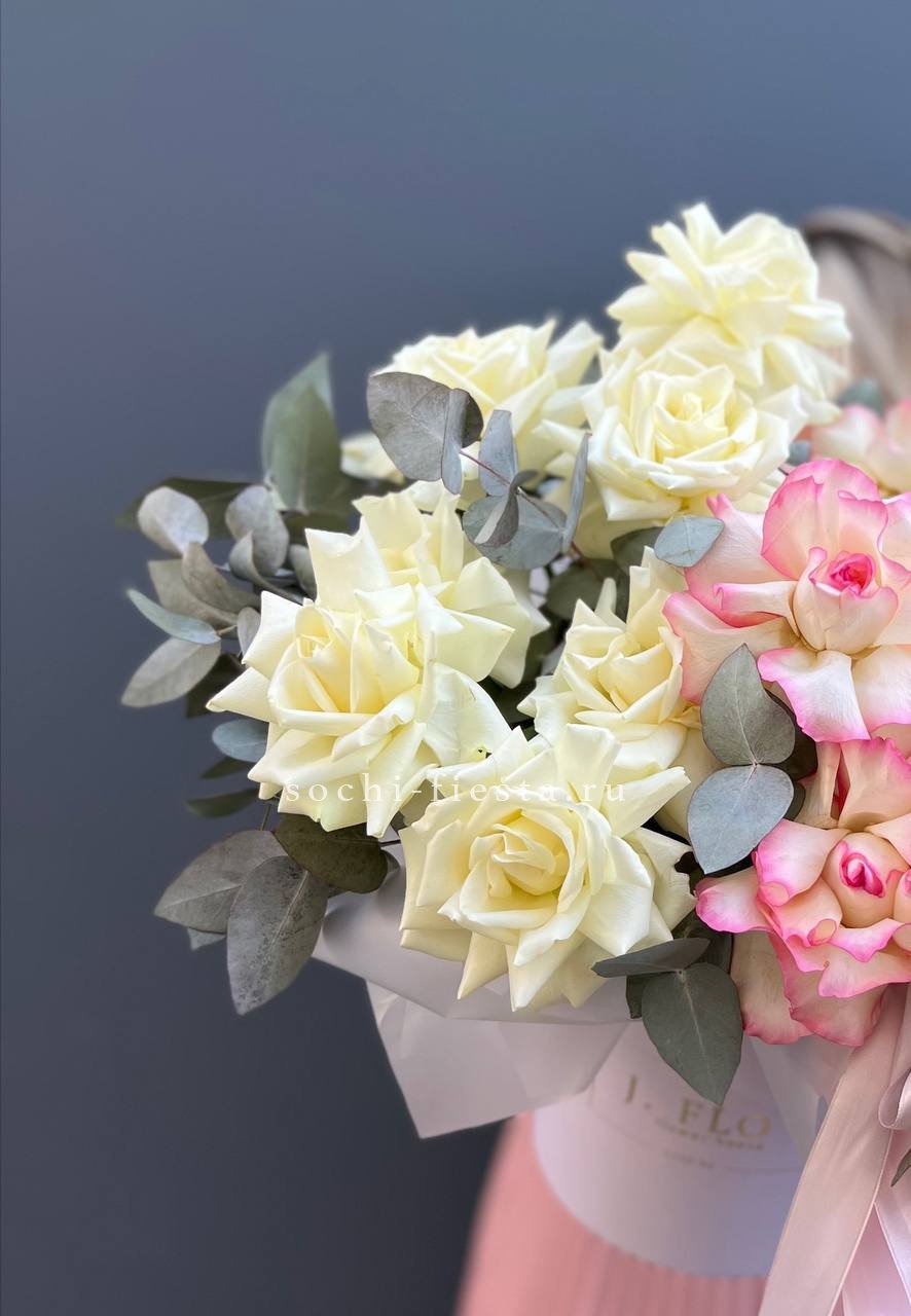пионовидная кустовая роза бомбастик - 31 веточек, эвкалипт, лента, цилиндр D20.
