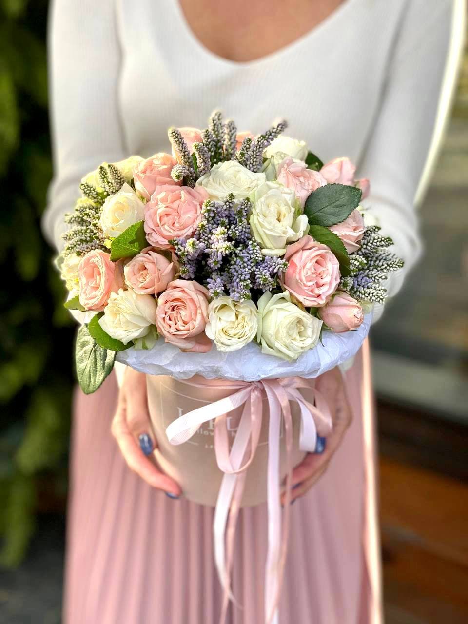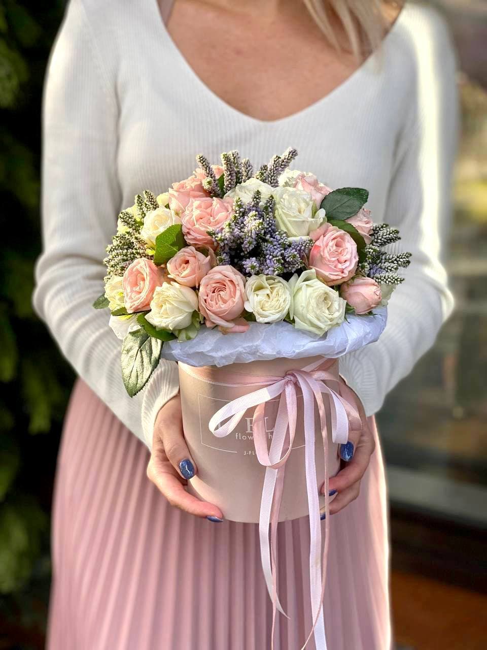 Тридцать пять белоснежных бутонов образуют плотное соцветие безупречной формы. Светлый цилиндр подчеркивает чистоту линий и создает завершенный монохромный образ.