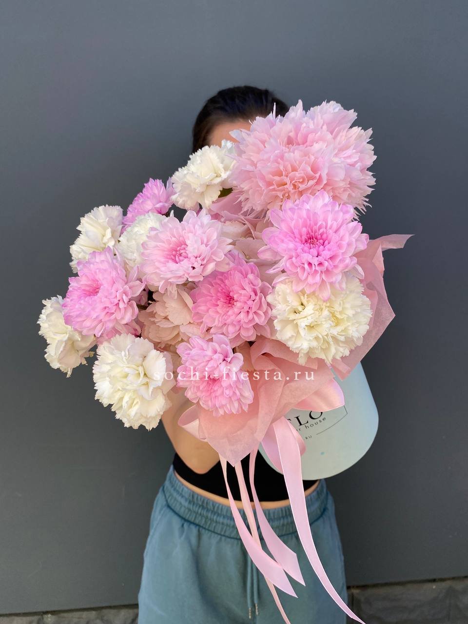 гортензия, розы, озотамус, диантус, бомбастик, хлопок, хризантема бокс 16.