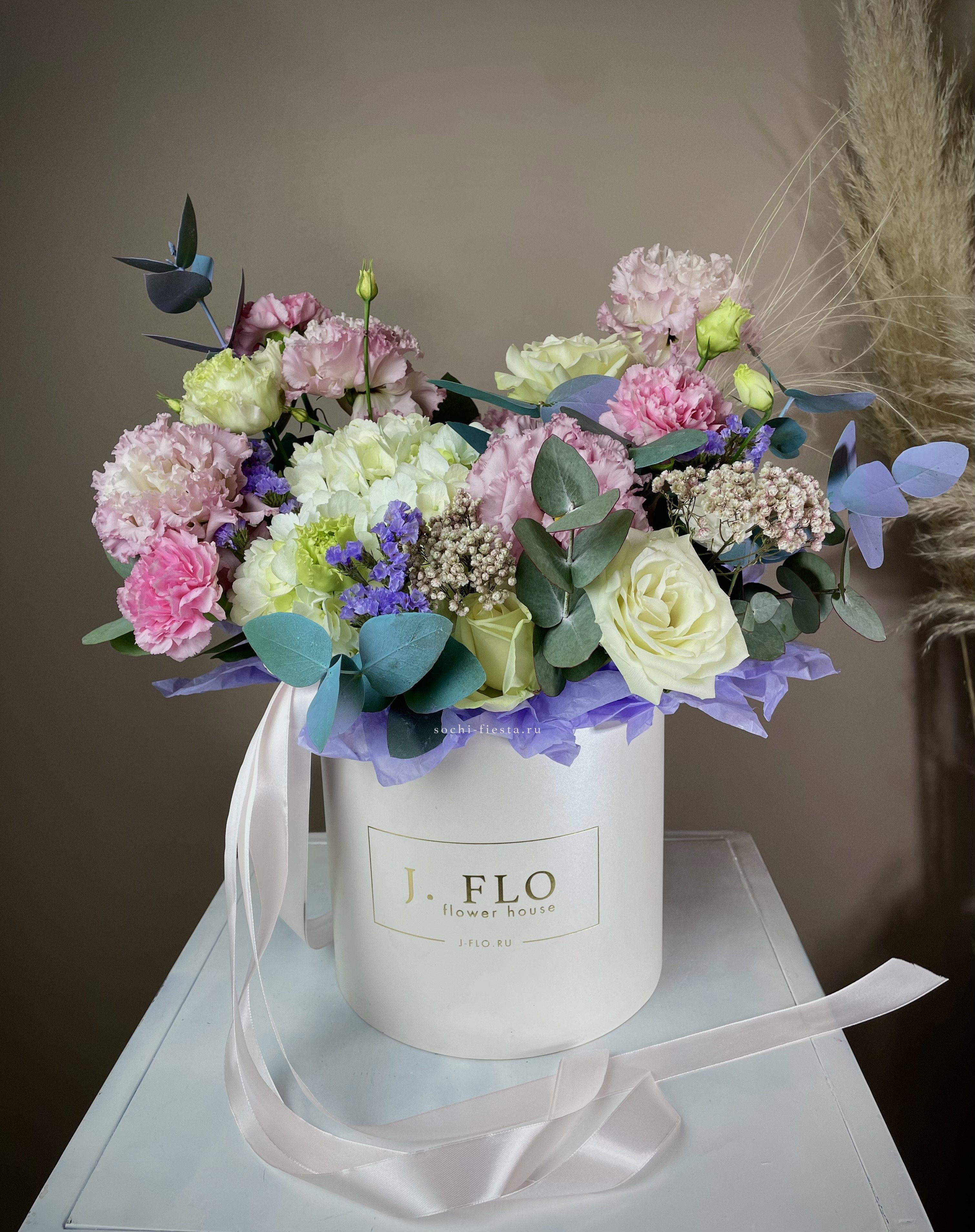 пионовидная роза сорта Мисти бабблс, эвкалипт в коробке или корзине.