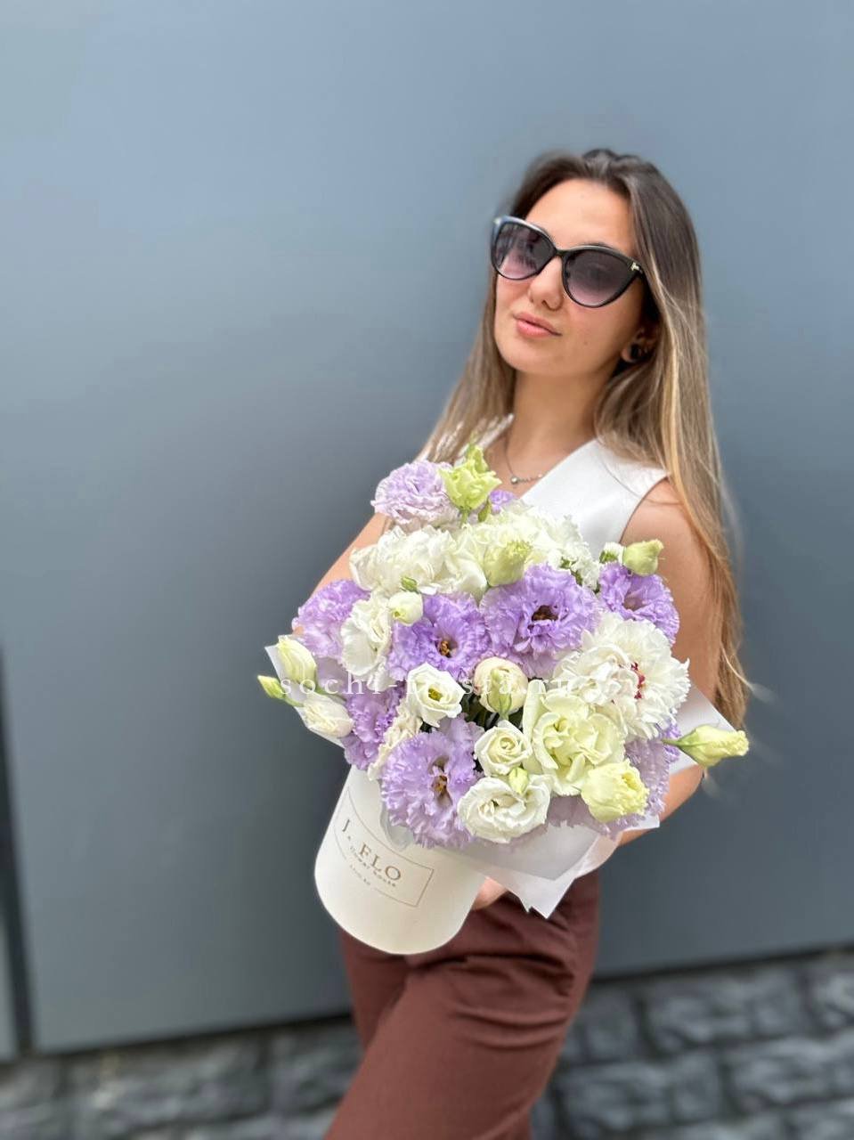 Эустома и пионы в цилиндре дают мягкое цветовое пятно с воздушной текстурой. Эвкалипт обрамляет композицию и добавляет свежую зелёную ноту общему впечатлению.
