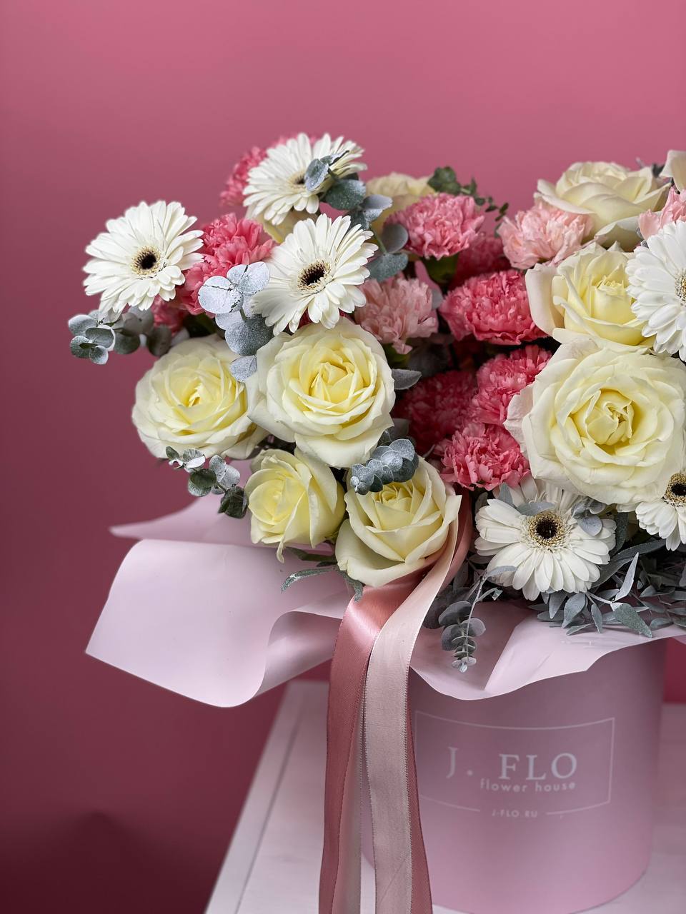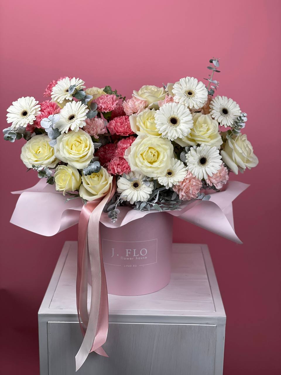 Белый и красный встречаются в одной композиции, где каждый оттенок занимает своё место. Хризантема добавляет плотности и завершает линию цилиндра.