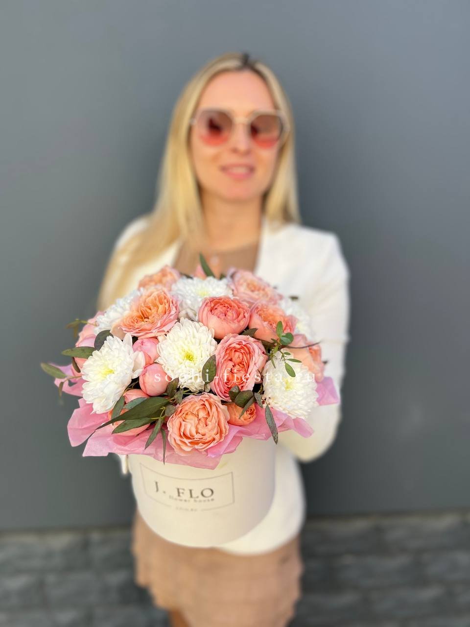 Пионовидные розы Джульетта в пудровых оттенках собраны плотно и дополнены белыми хризантемами. Эвкалипт обрамляет композицию мягкими серо-зелеными ветками.