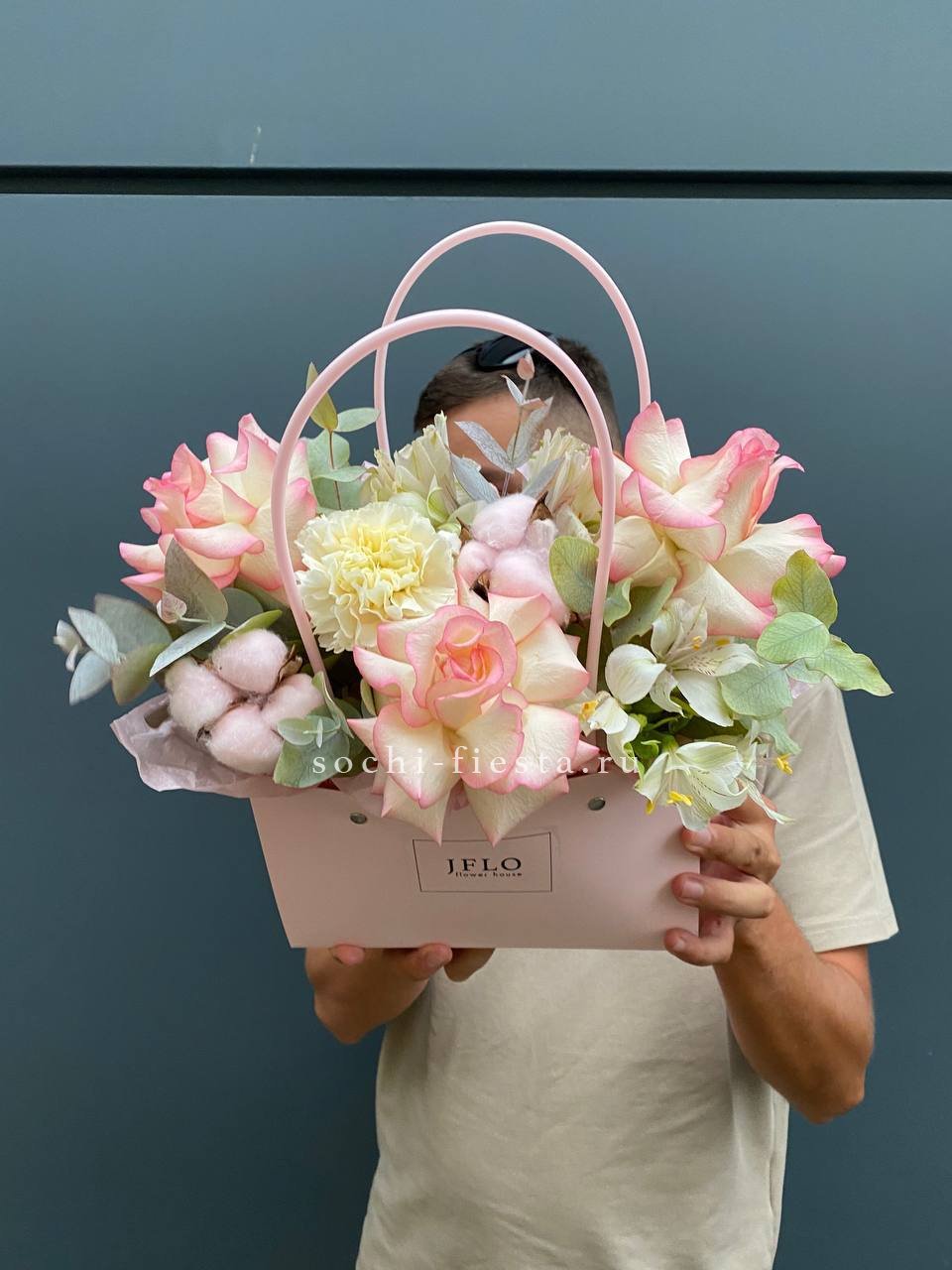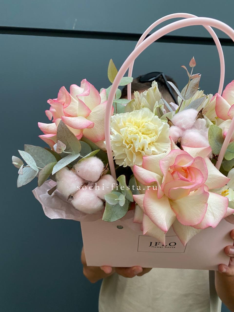 Пышные головки пионовидных роз задают объём, а мелкие соцветия диантуса разбивают плотность. Гортензия добавляет воздушную текстуру, эвкалипт смягчает линии. Композиция в сумке-кашпо выглядит свободно и живо.
