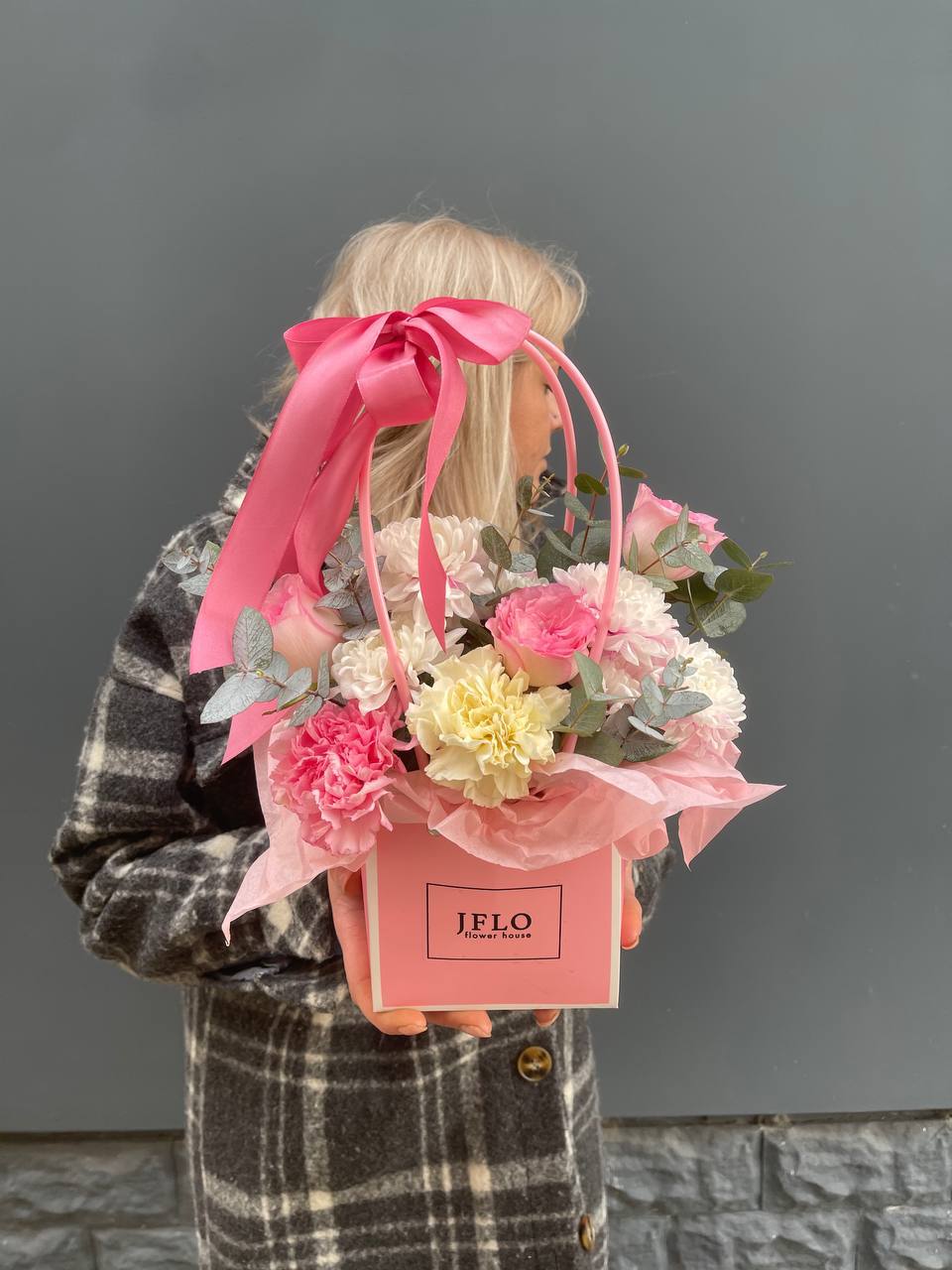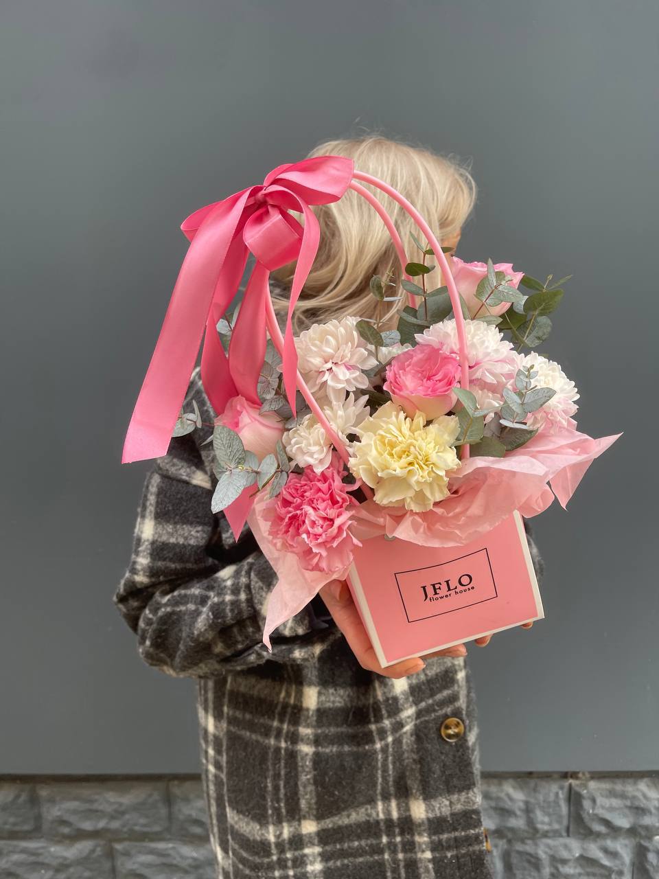 Герберы и маттиола вместе с диантусами выстраивают вертикальный ритм в flower bag. Белая роза и кустовая хризантема добавляют композиции завершенность.