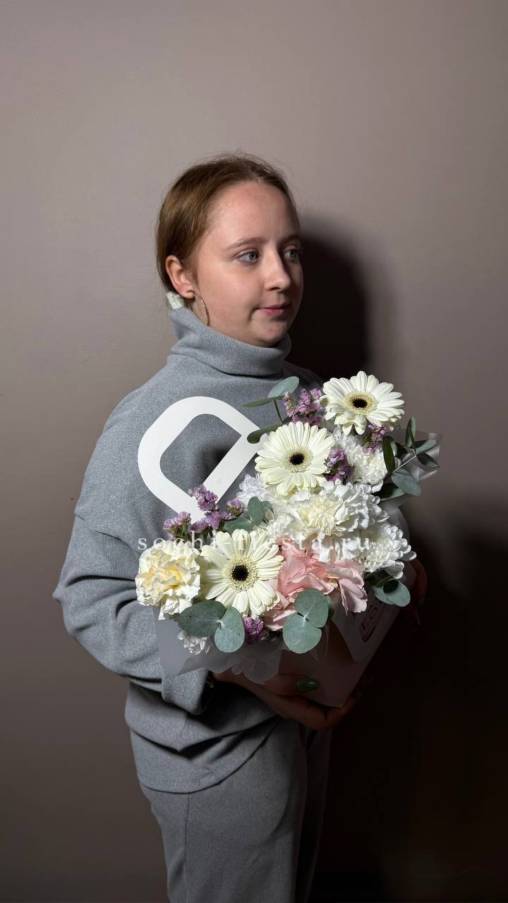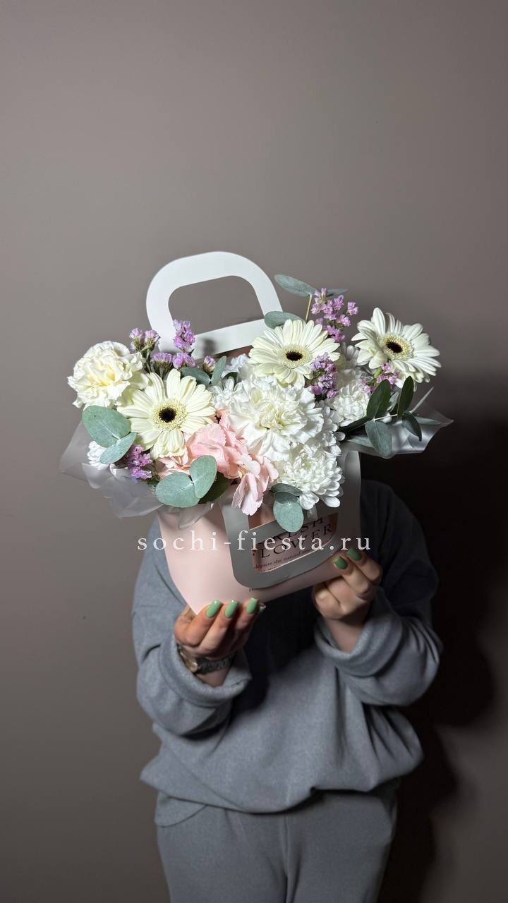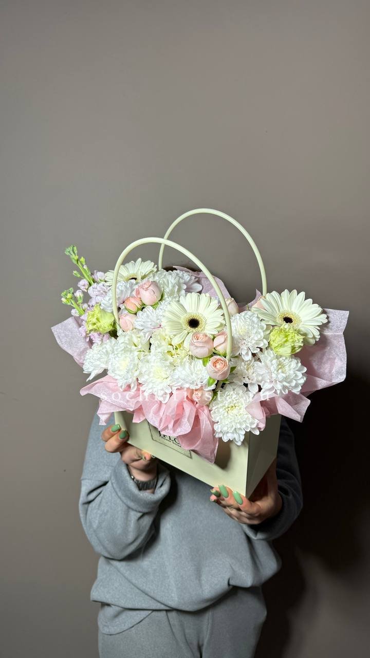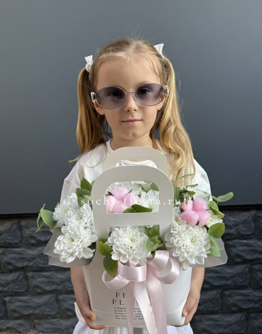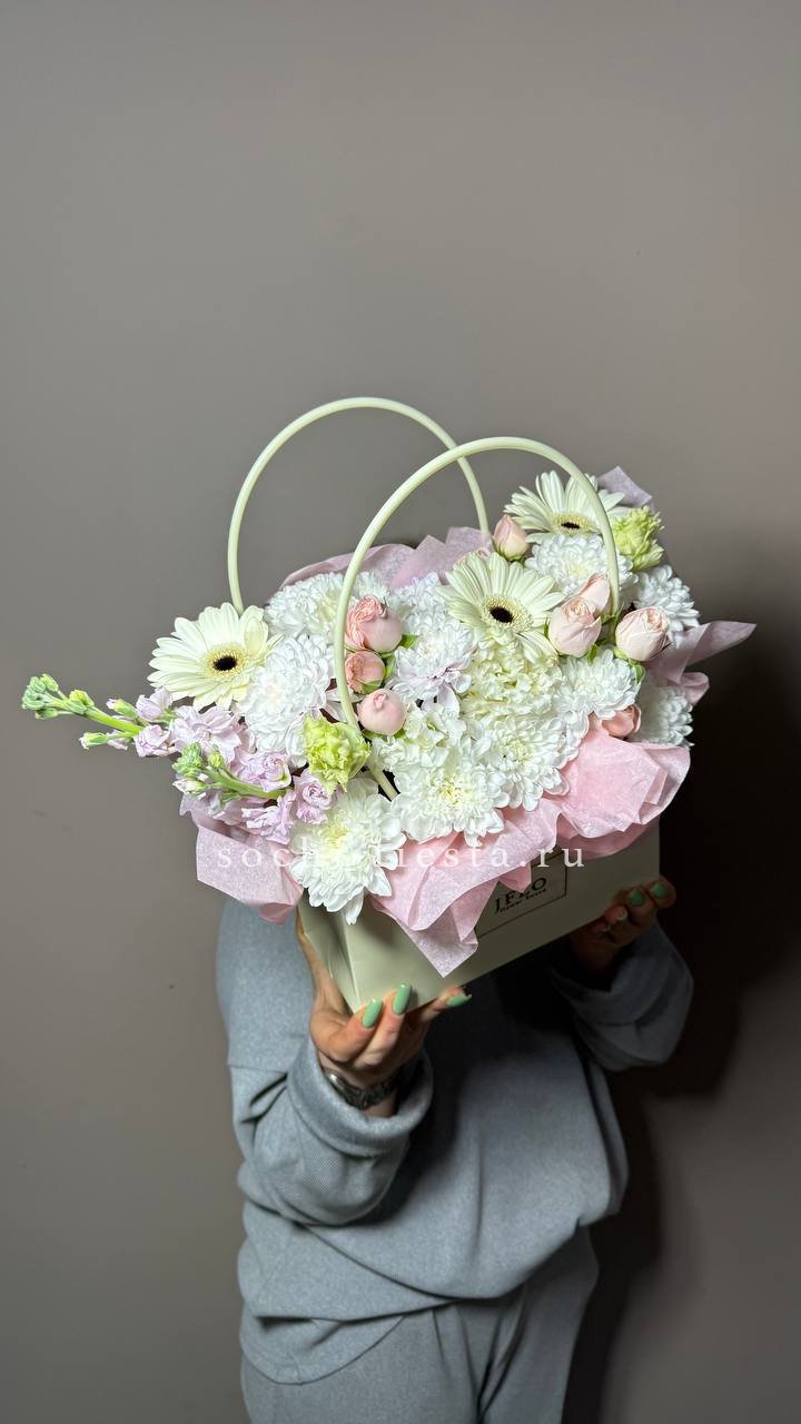 Хризантемы с пушистыми коробочками хлопка создают теплую домашнюю композицию в удобной сумочке. Цветы долго радуют взгляд и не требуют сложного ухода. Формат подходит для размещения в любом уголке дома.