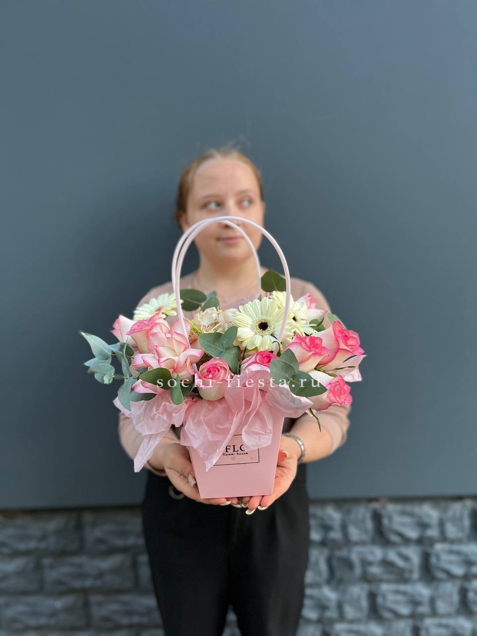 Французские розы двух оттенков собраны плотной шапкой в компактной сумочке. Белый и красный создают чёткий визуальный ритм без лишних деталей. Формат удобен для подарка или украшения пространства.