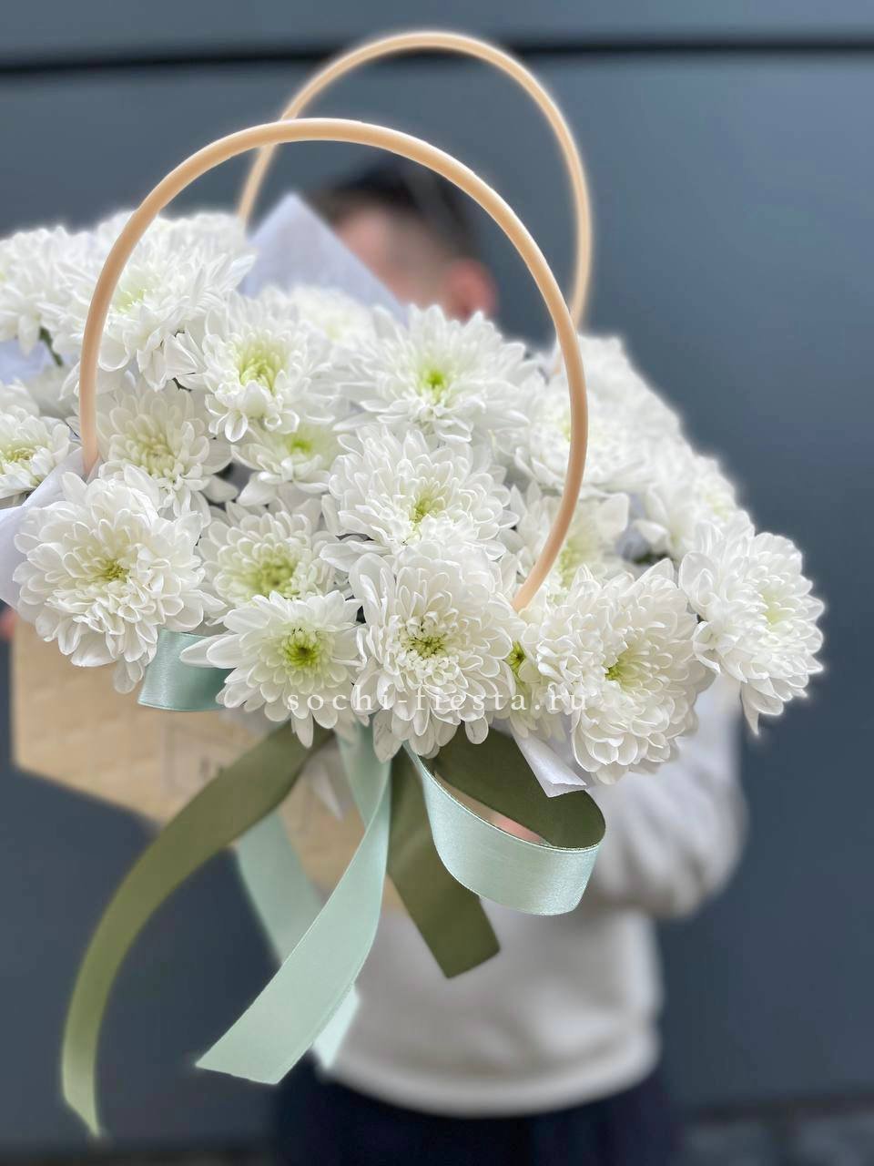 хризантема кустовая, лента, сумка-кашпо.