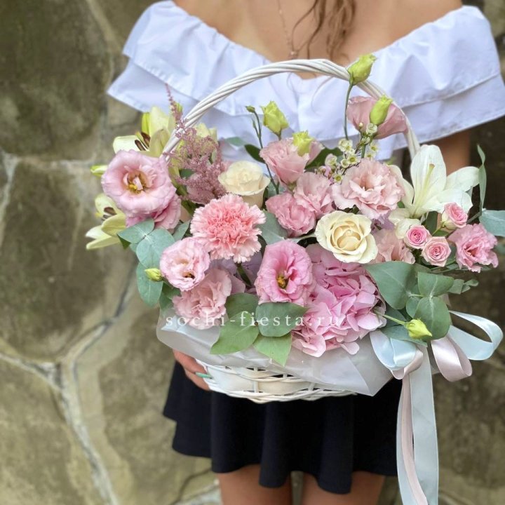 Садовая корзина — главный тренд последних лет. Свободная многовидовая аранжировка в плетёной корзине: эустома, ранункули, нигелла, зелень — ощущение только что срезанных цветов из загородного сада. Покупают те, кто устал от строгих классических форматов и ищет природной органики и лёгкости в подарке.
