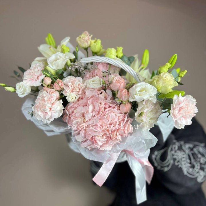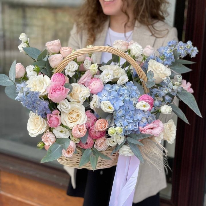 корпоративная цветочная корзина в нейтральной деловой гамме с фирменной лентой для поздравления партнёров садовая цветочная корзина с ранункулями эустомой и эвкалиптом в свободной аранжировке от флориста
