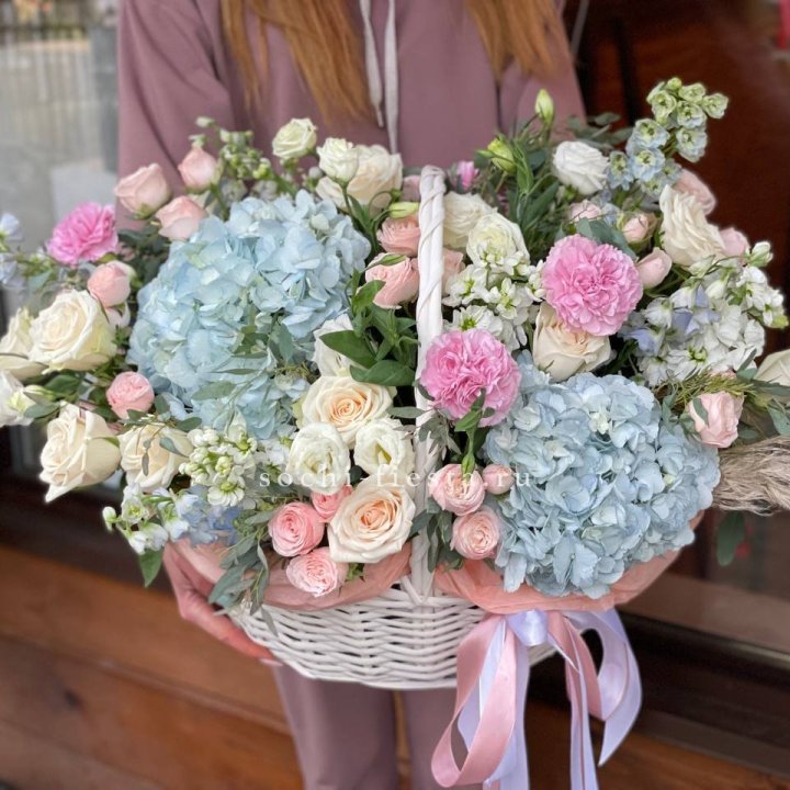 Садовая корзина — главный тренд последних лет. Свободная многовидовая аранжировка в плетёной корзине: эустома, ранункули, нигелла, зелень — ощущение только что срезанных цветов из загородного сада. Покупают те, кто устал от строгих классических форматов и ищет природной органики и лёгкости в подарке.
