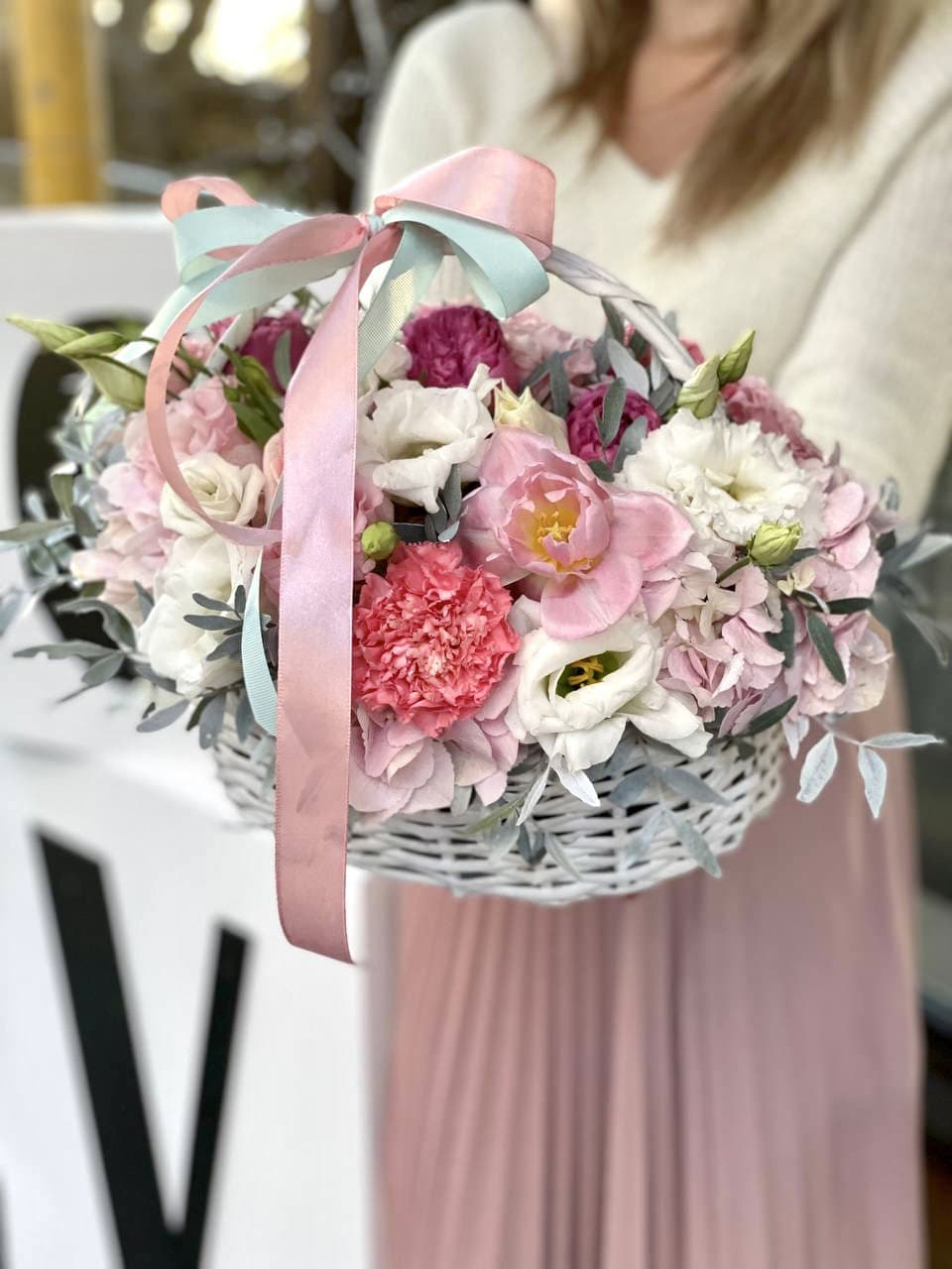 гортензия, эустома, розы, маттиола (дельфиниум или аналоги), кустовые розы, лента, корзина D40
