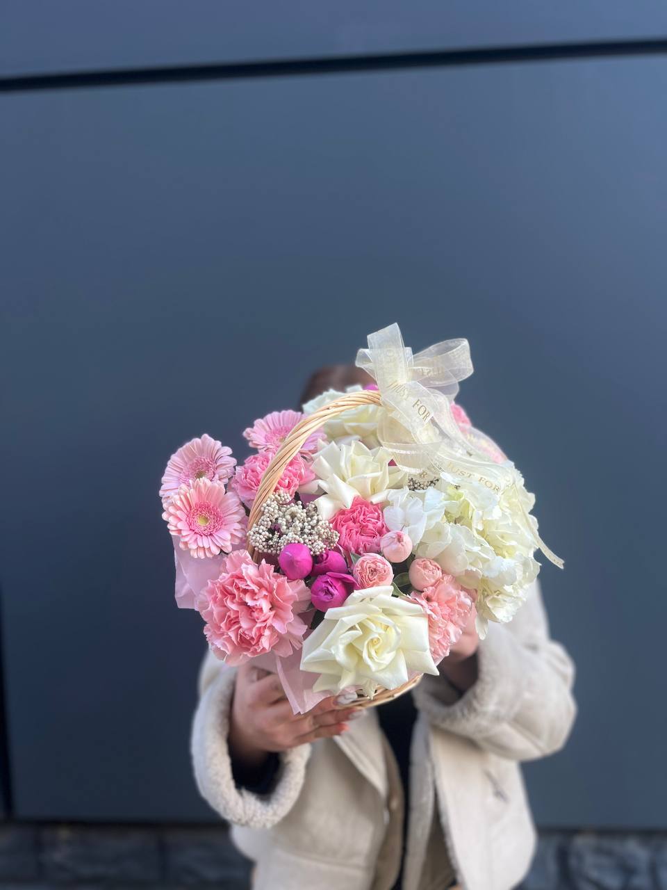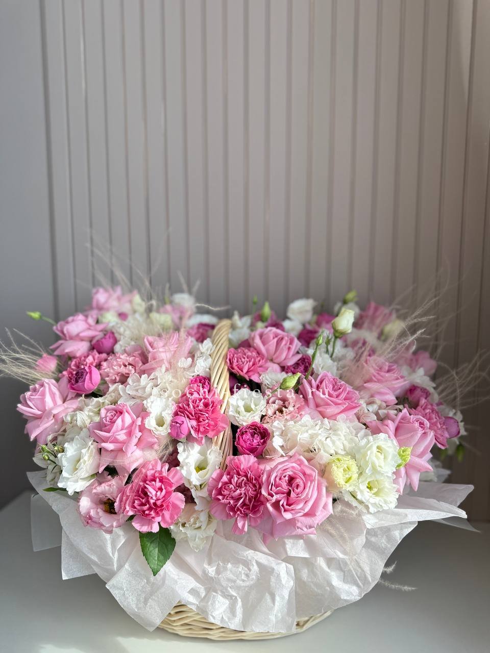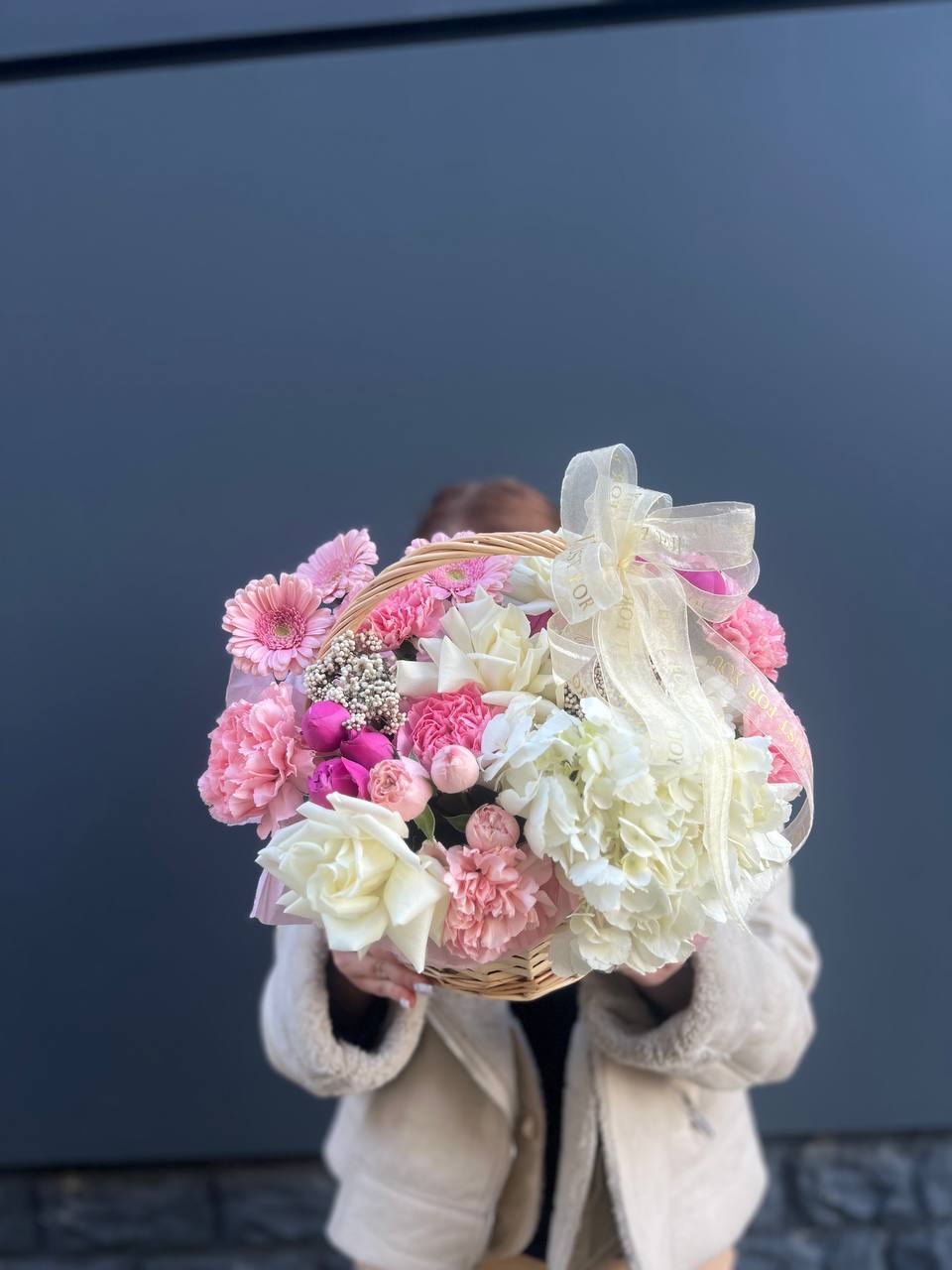 Корзина объединяет гортензии, эустомы, розы и маттиолу в многослойную композицию. Разные фактуры лепестков создают визуальную глубину и насыщенность.
