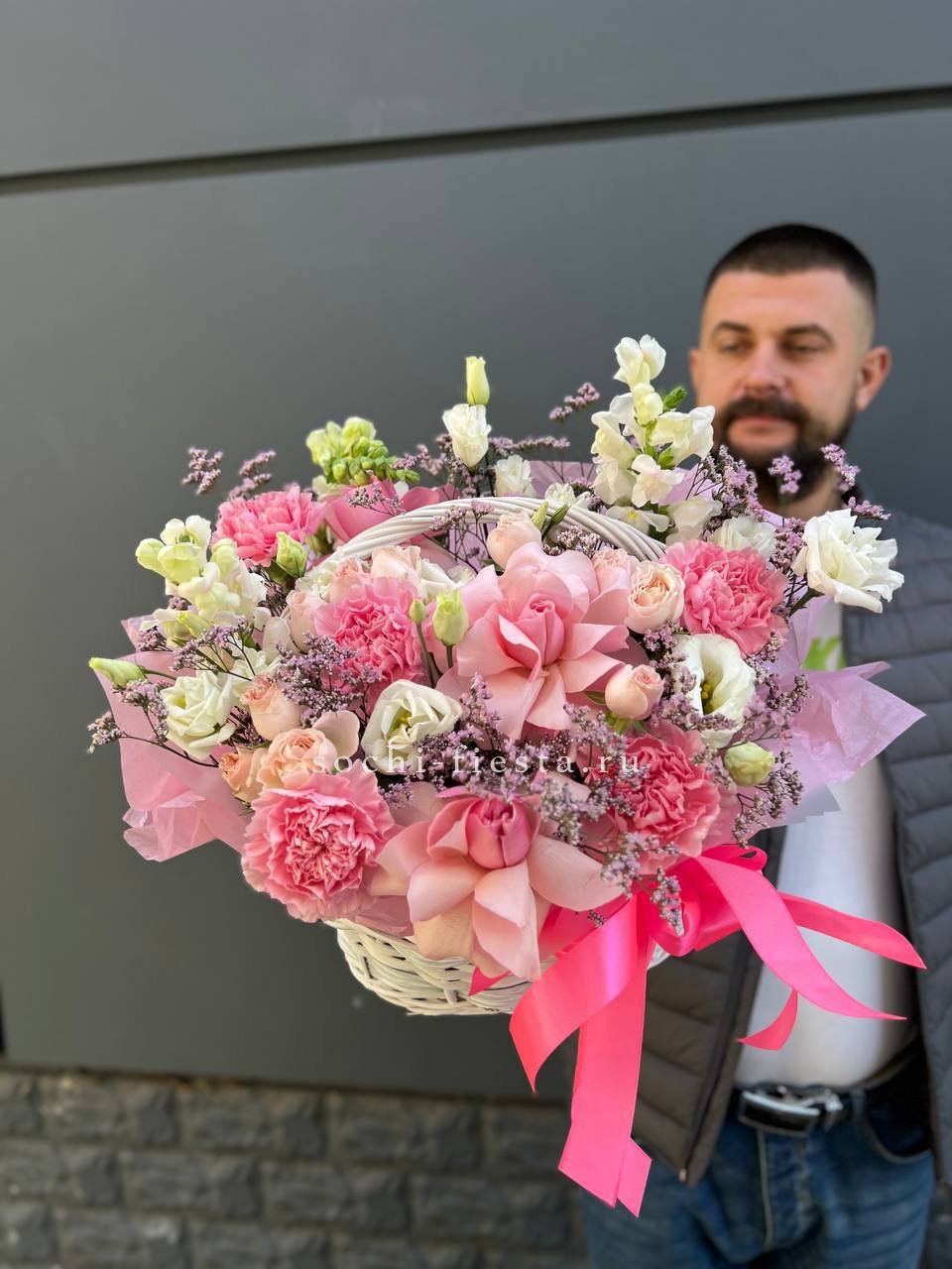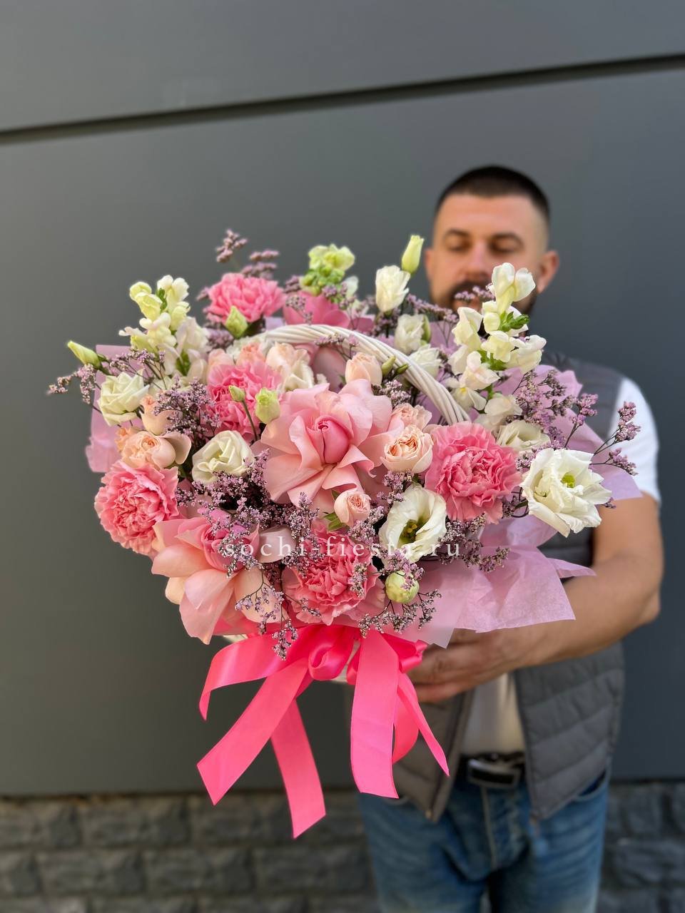 цветочная корзина с розами, мисти баблс, диантусами и гортензией.
