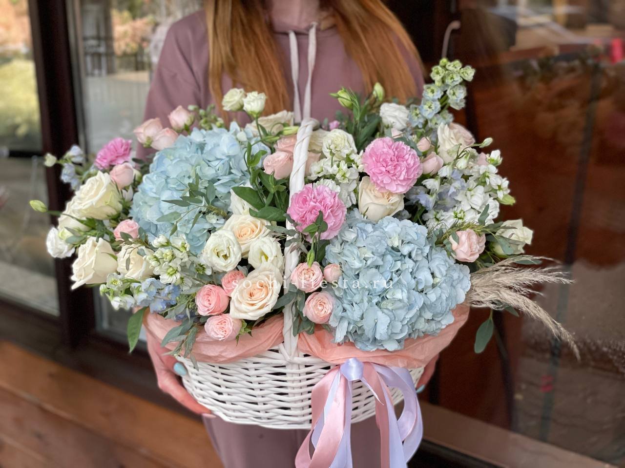 орхидея, гортензия, эустома, роза, эвкалипт, альстромерия, лента, корзина.