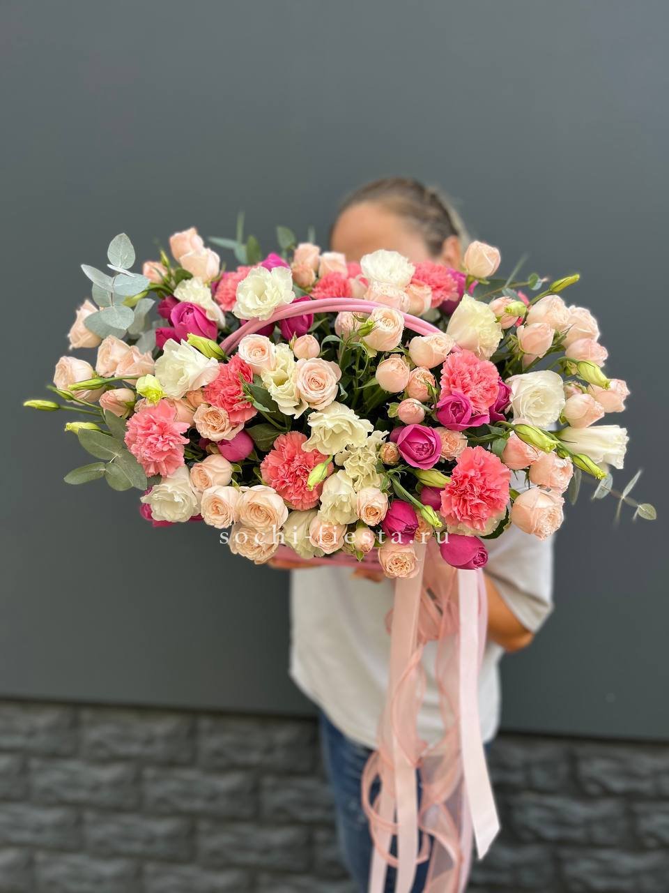 розы кустовые, диантусы, эустома, лента, корзина D35.