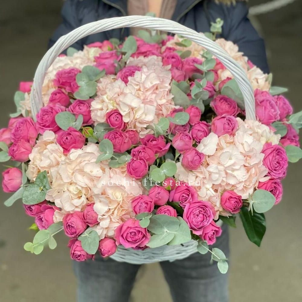 Радужный каскад из девяти видов цветов собран в плавный переход оттенков от холодных до теплых тонов. Гортензии создают объемную базу, а герберы и антирринум добавляют вертикальные акценты.