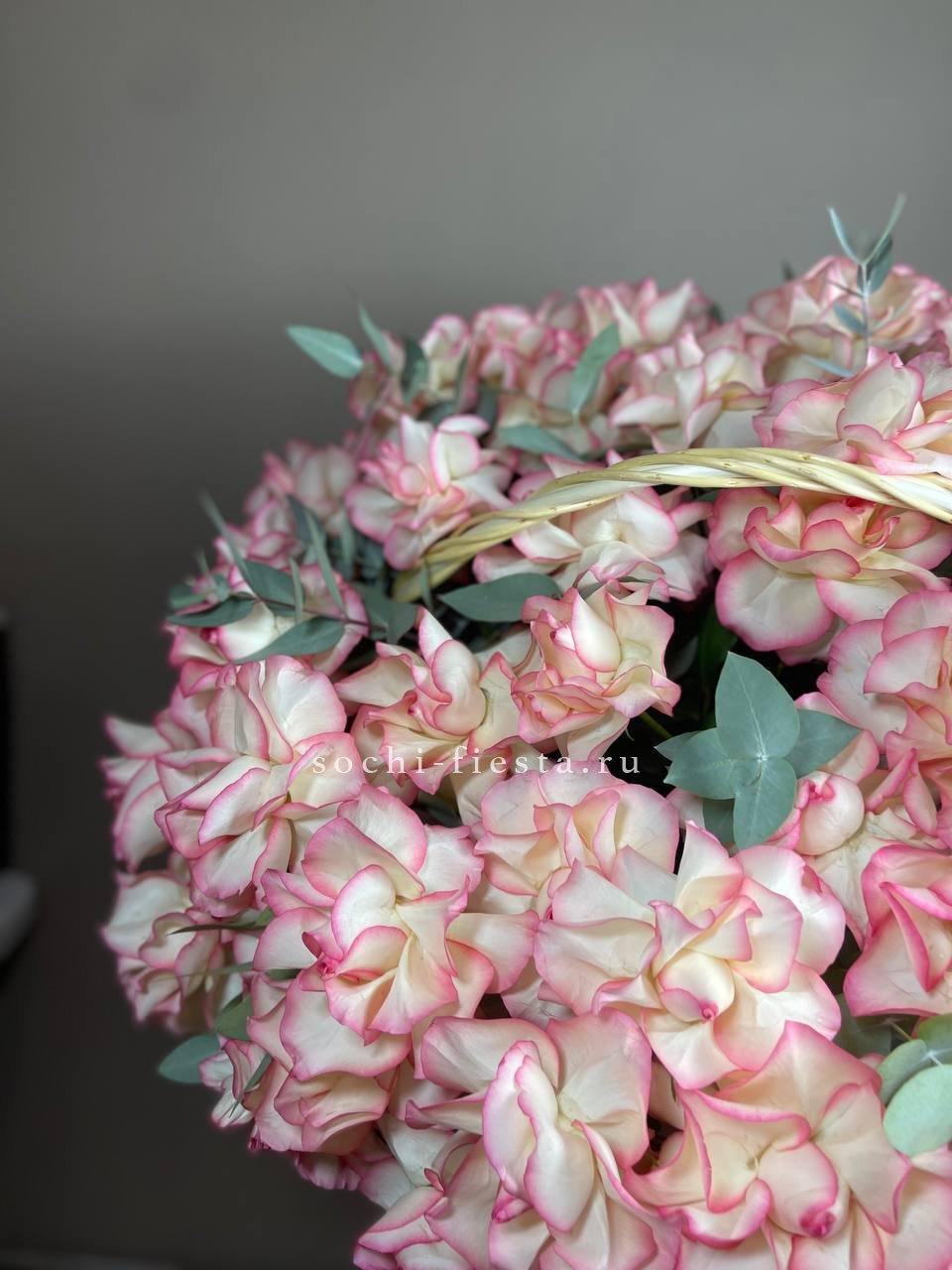 коробка с цветами разноцветного градиента (гортензии, розы, герберы, диантусы, кустовые розы, альстромерии, хризантемы, антирринум, озотамус).