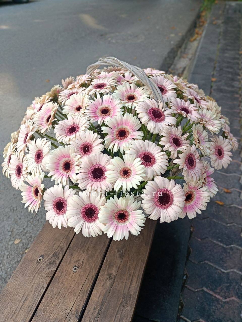 Шестьдесят одна голландская гербера собрана в плетёной корзине и создаёт яркое цветовое пятно высотой сорок сантиметров. Плотная россыпь соцветий держит форму и радует взгляд несколько дней подряд. Композиция не требует вазы и сразу готова к размещению в любом интерьере.